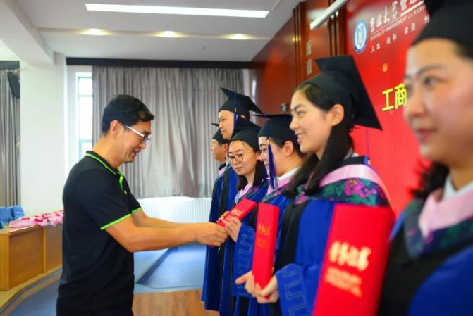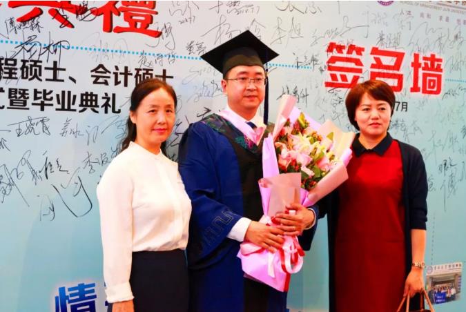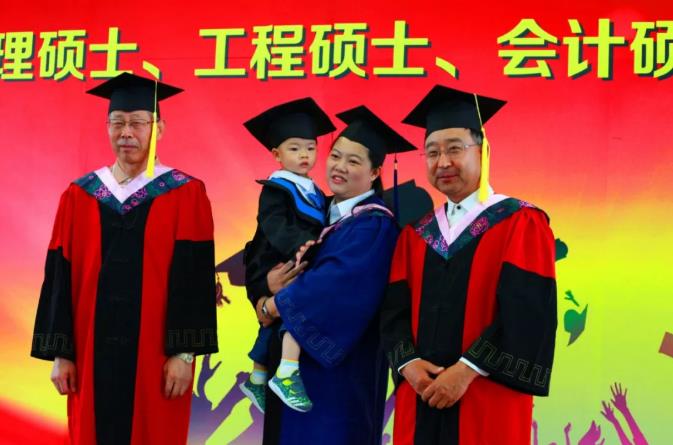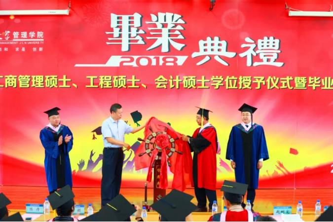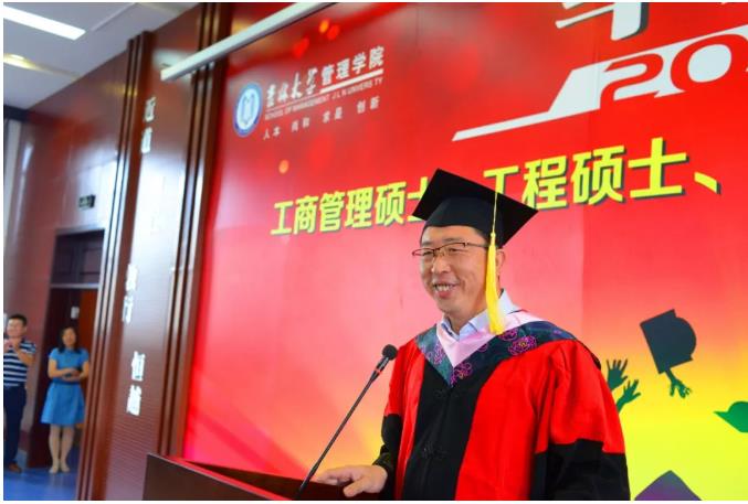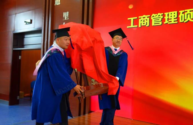 典礼进行第三项:经年花开,回忆流年。首先,在制作精美的视频短片中,同学回顾了两年来在管理学院学习与生活的点滴过往和欢声笑语。继而,毕业生代表2016级工商管理硕士马涛发表毕业感言,马涛同学分享了专业学位研究生的“兼得的哲学”,回忆了追求“工作和学习兼得、学习和生活兼得”过程中的收获与成长,对认真给予同学们指导和帮助的导师们表示真切的谢意。接下来,各系主任和系书记作为教师代表为毕业生们送上毕业寄语。老师们鼓励同学们在今后的人生道路上继续奋勇前行,追求卓越,开拓创新,成为商业模式创造者和引领者。老师们的谆谆教诲与殷切期望使学生们再一次感受到师恩如山,怀着深深的敬意,2018届MBA毕业生代表王铁、王柏松为学院献礼,张兴林书记、赵树宽院长代表学院共同接受了这座领航舵,并表示学院必将承载同学们的信任驾风远航。
