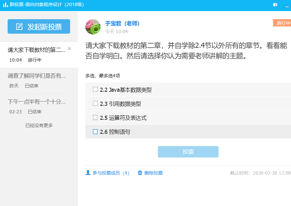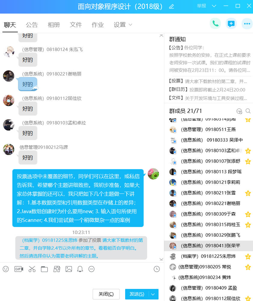 第一节课后,老师布置了自学第二章中的一节——“Java基本数据类型”的课后任务,第二天,信息系统专业18级的张荣芊同学通过QQ向老师反馈学习感受“因为有C语言的学习基础,整个第二章自学起来感觉都不困难”。老师迅速地根据这个反馈意见,通过QQ群要求大家自学整个第二章,并在周五之前,通过投票的方式,反馈这一章中每个主题掌握的情况。进而根据大家的学习情况反馈,及时地调整讲课内容和课堂计划。