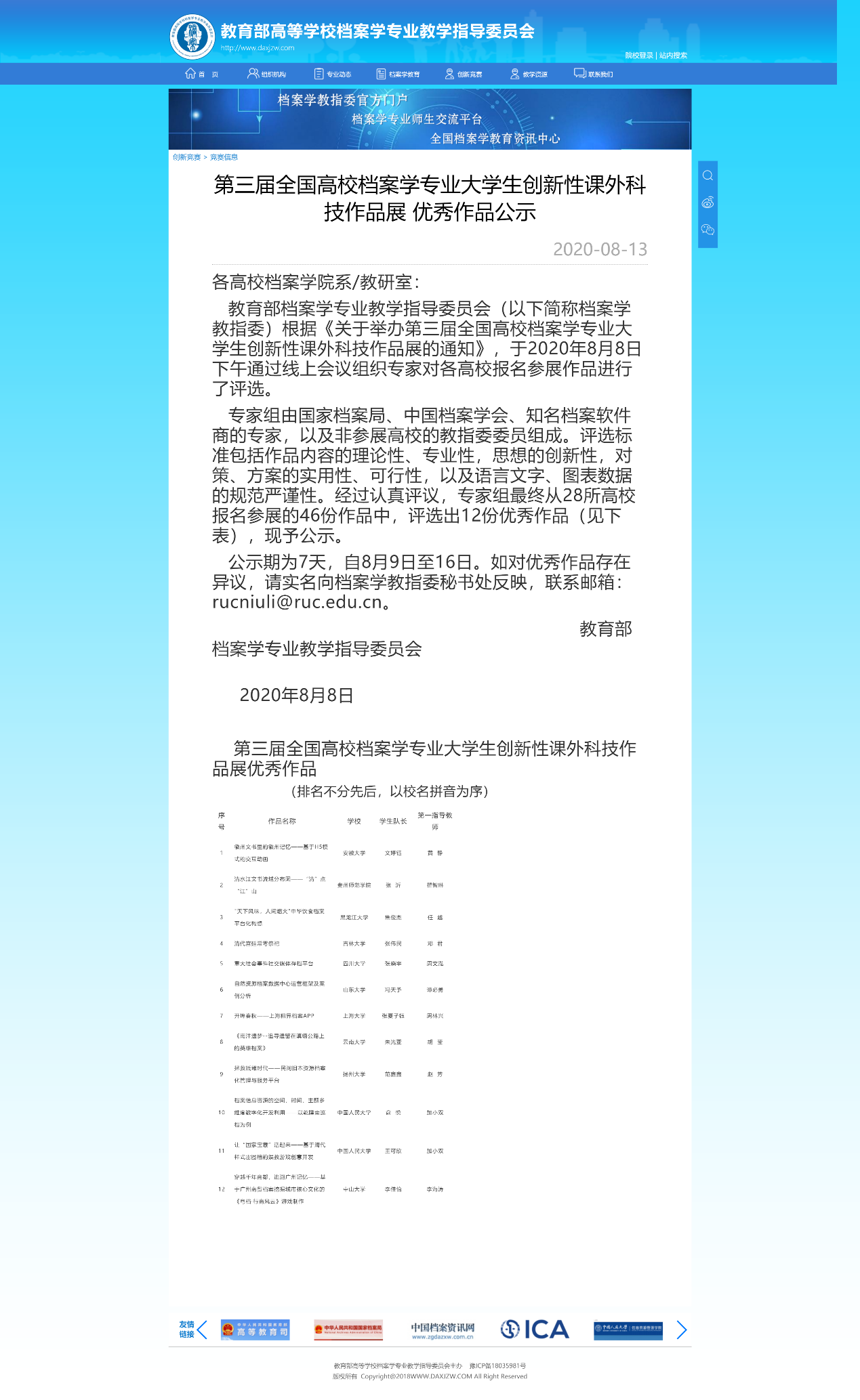 2020年8月8日,由教育部高等学校档案学专业教学指导委员会(以下简称教指委)主办,贵州师范学院承办的第三届全国高校档案学专业大学生课外科技作品展(以下简称档案创新大赛)以线上形式顺利举行。本届档案创新大赛共有来自全国28所高校共46个团队参赛,经过全国档案专业教指委委员、国家档案局、中国档案学会、知名档案软件企业相关专家严格评审,最终评选出12份优秀作品。P站