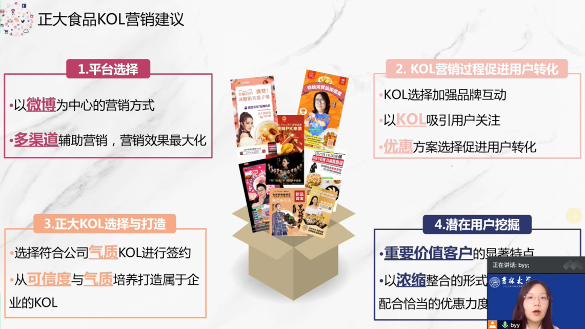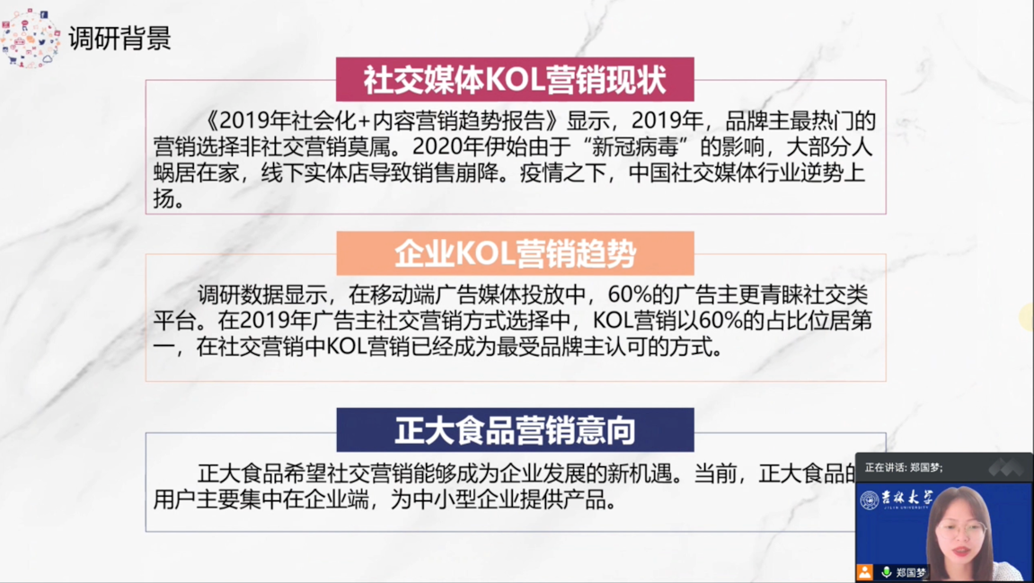 代表队,由管理学院王晰巍教授作为指导老师带领的2017级管理学院本科生郑国梦、陶冰心和毕樱瑛3名同学共同完成的《如何在直播带货中“C位”出道——正大食品Influencer Marketing的KOL用户行为及营销调查研究》作品,通过网赛、校赛、省赛和国赛的层层选拔,荣获全国总决赛国家级一等奖,这也是P站