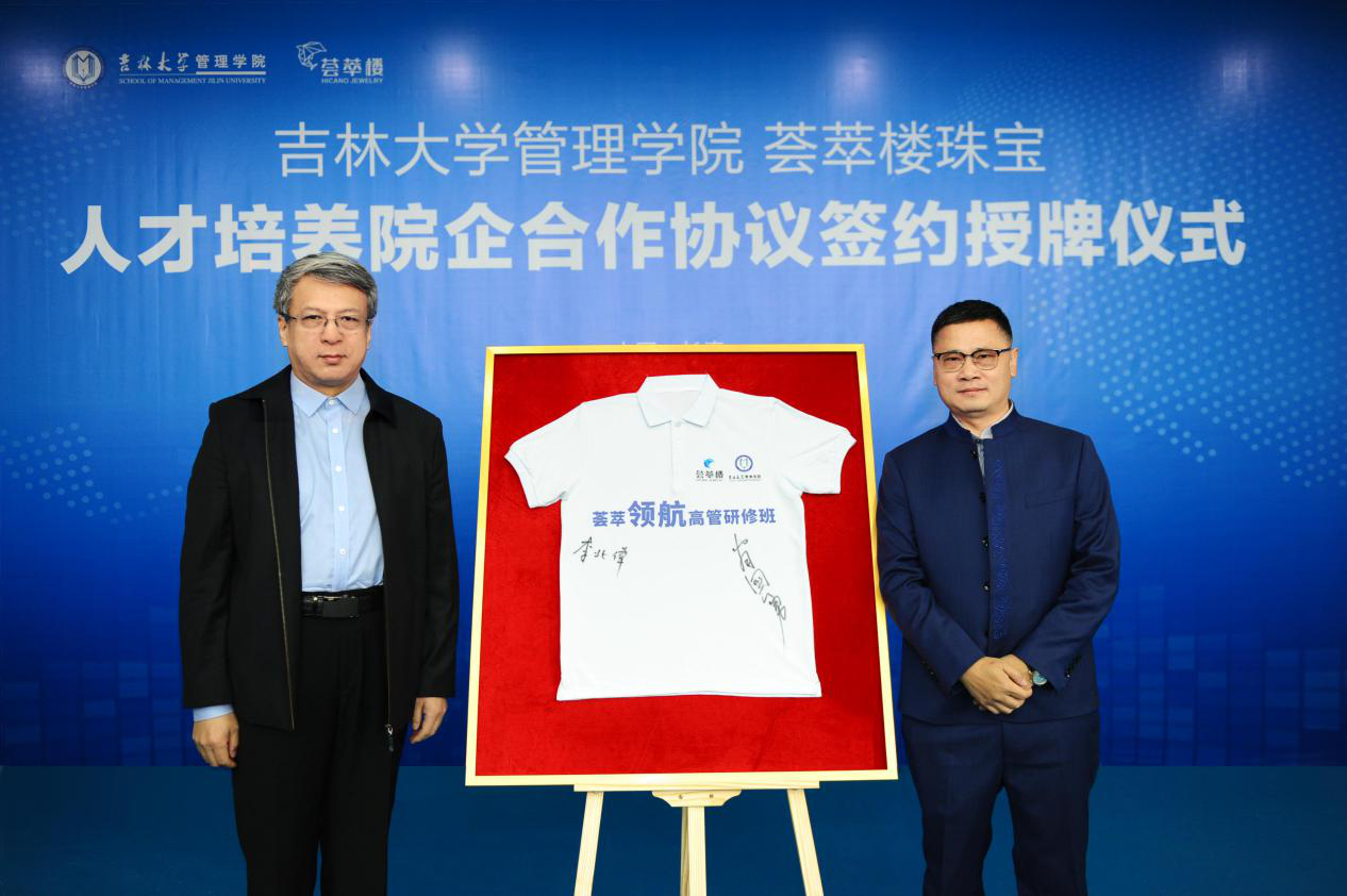 管理学院实践教学基地”合作协议。李北伟院长亲自授予荟萃楼珠宝“本科生实践教学基地”牌匾;翁国勇总裁和李北伟院长共同在荟萃领航高管研修班的纪念版文化衫上签名,作为荟萃楼珠宝开启人才战略的鉴证。