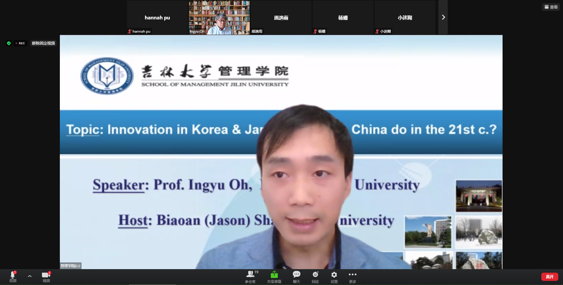 随着中国企业在创新方面的活力被激发,如何吸收国外的先进经验,走出符合中国国情的创新路径已成为研究热点。为启发学院师生对中国在创新方面与其他国家的差异及改进路线进行深度剖析和思考,2021年9月20日下午13:30,管理学院成功邀请日本关西外国语大学Ingyu Oh教授为我校师生作题为《Innovation in Korea and Japan: What can China do in the 21st century?》的学术报告,报告采取线上形式,由技术经济及管理系单标安副教授主持此次学术报告。