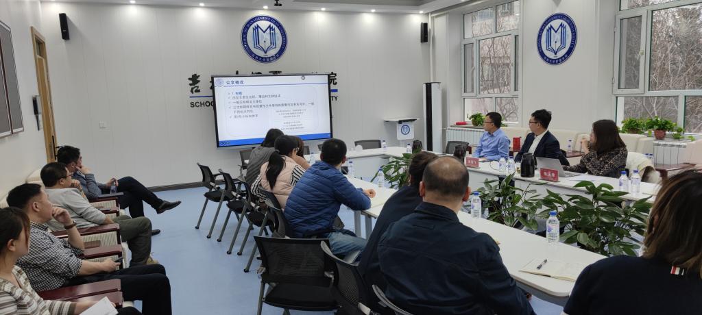为进一步提升学院机关工作人员的综合素质和履职能力,12月10日,管理学院邀请校长办公室高恒飞、张玉珠两位老师,与学院机关全体工作人员一起就公文写作与处理进行交流,交流会由行政副院长马腾主持。