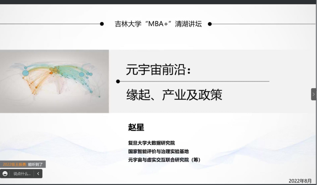 8月14日晚,清湖讲坛第二讲如期在云端举办。中心邀请复旦大学大数据研究院博士生导师赵星教授做题为《元宇宙前沿:缘起、产业与中国模式》专题讲座。本次活动由MBA教育中心主任兼P站