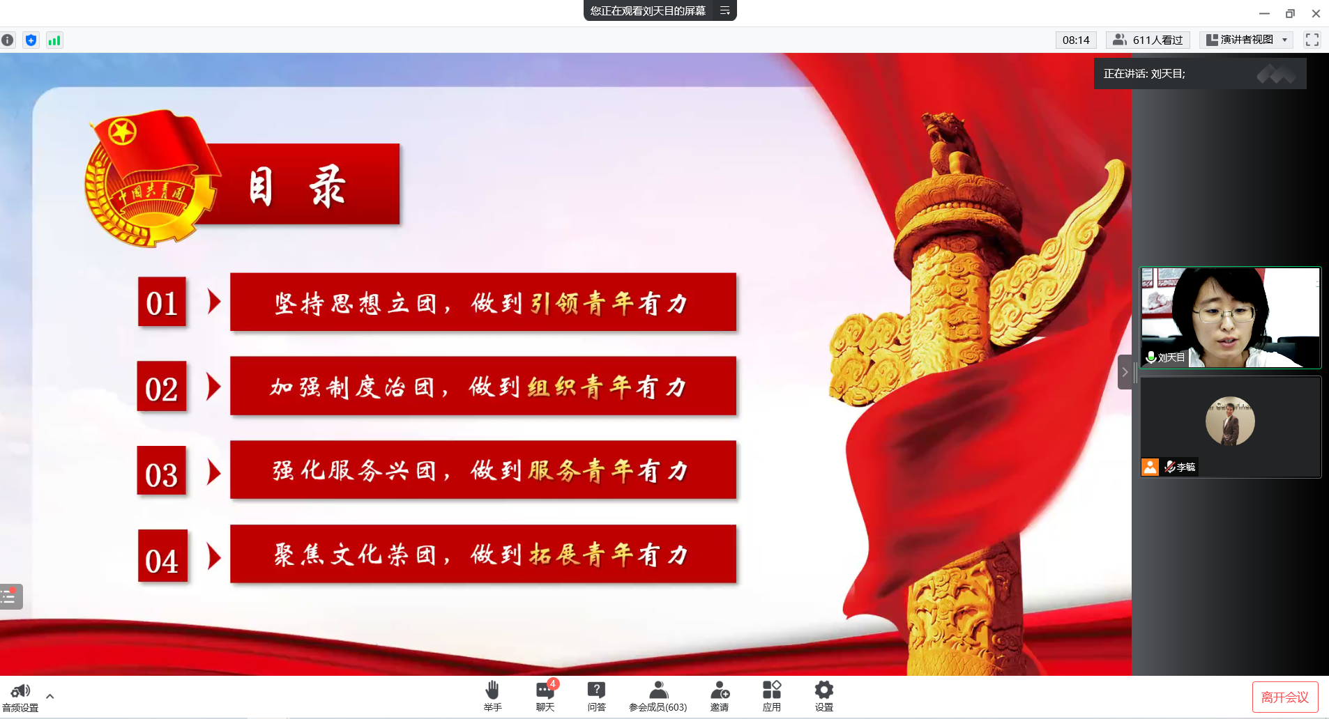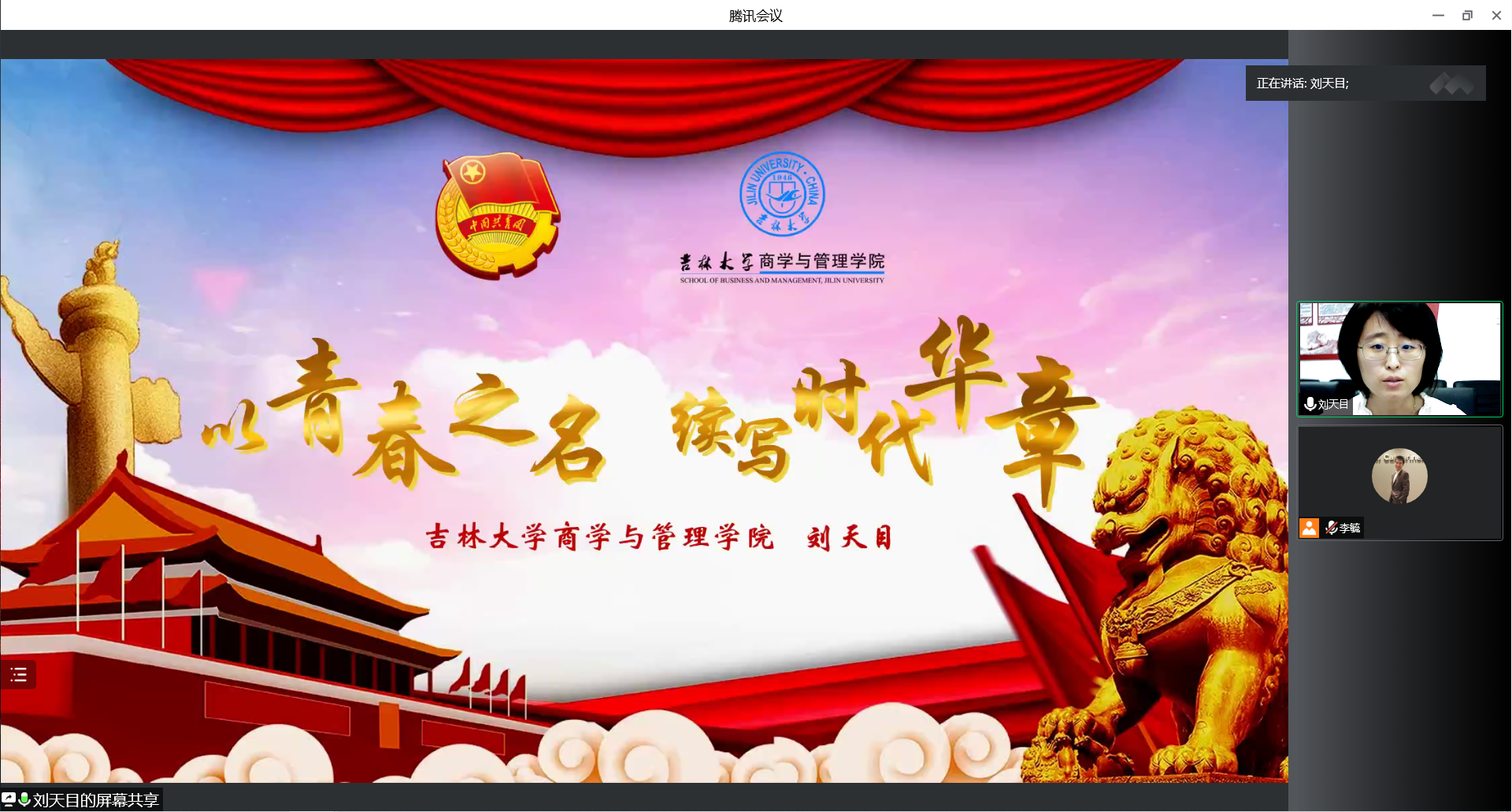 团委书记刘天目老师于2022年8月30日通过腾讯会议为2022级新生举办了“以青春之名,续写时代华章”的线上主题团课活动。