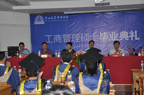 2010级学员、北京高鹏杭州律师事务所主任钱育新同学和2011级学员杭州雅克汉方建筑设计有限公司董事长苏晓河分别代表毕业生发言,他们首先感谢了学院老师多年来的培养、指导,并表示在未来的工作和生活中,一定秉承管理学院的优良传统,继续努力奋斗,取得更优异的成绩,回报学校、回报社会。
