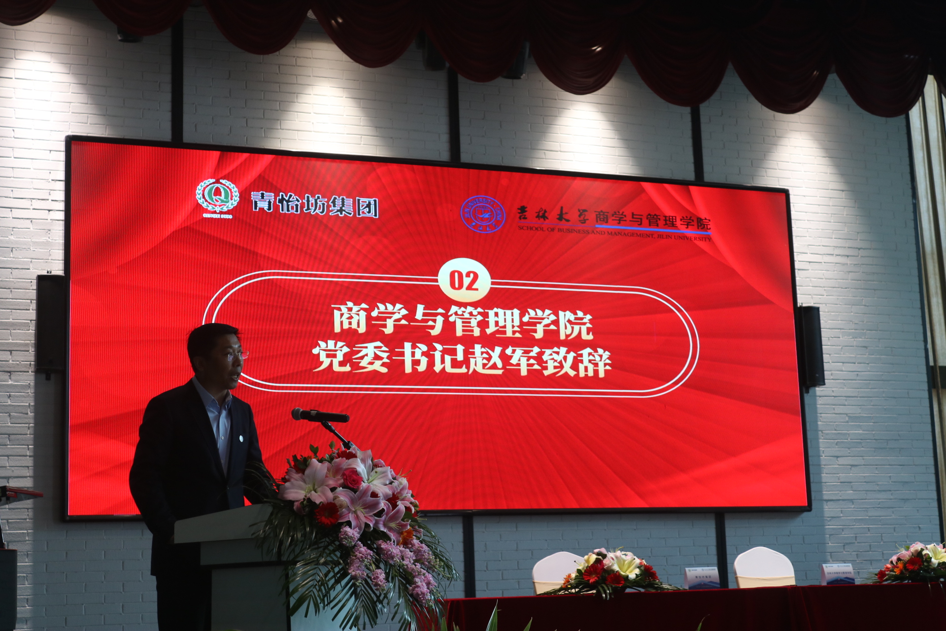 赵军在致辞中向青怡坊集团对学院发展的关心和支持表示感谢。他提到,实践育人工作是全面落实党的教育方针,把社会主义核心价值体系贯穿于国民教育全过程,深入实施素质教育,大力提高高等教育质量的必然要求。此次双方合作共建实习实践基地是加强联系、增进友谊的良好机会,希望借此机会进一步丰富实践育人协同体系,推动专业实践与社会实践的有机融合,拓展院企合作模式,释放院企合作优势,取得更多创新成果。