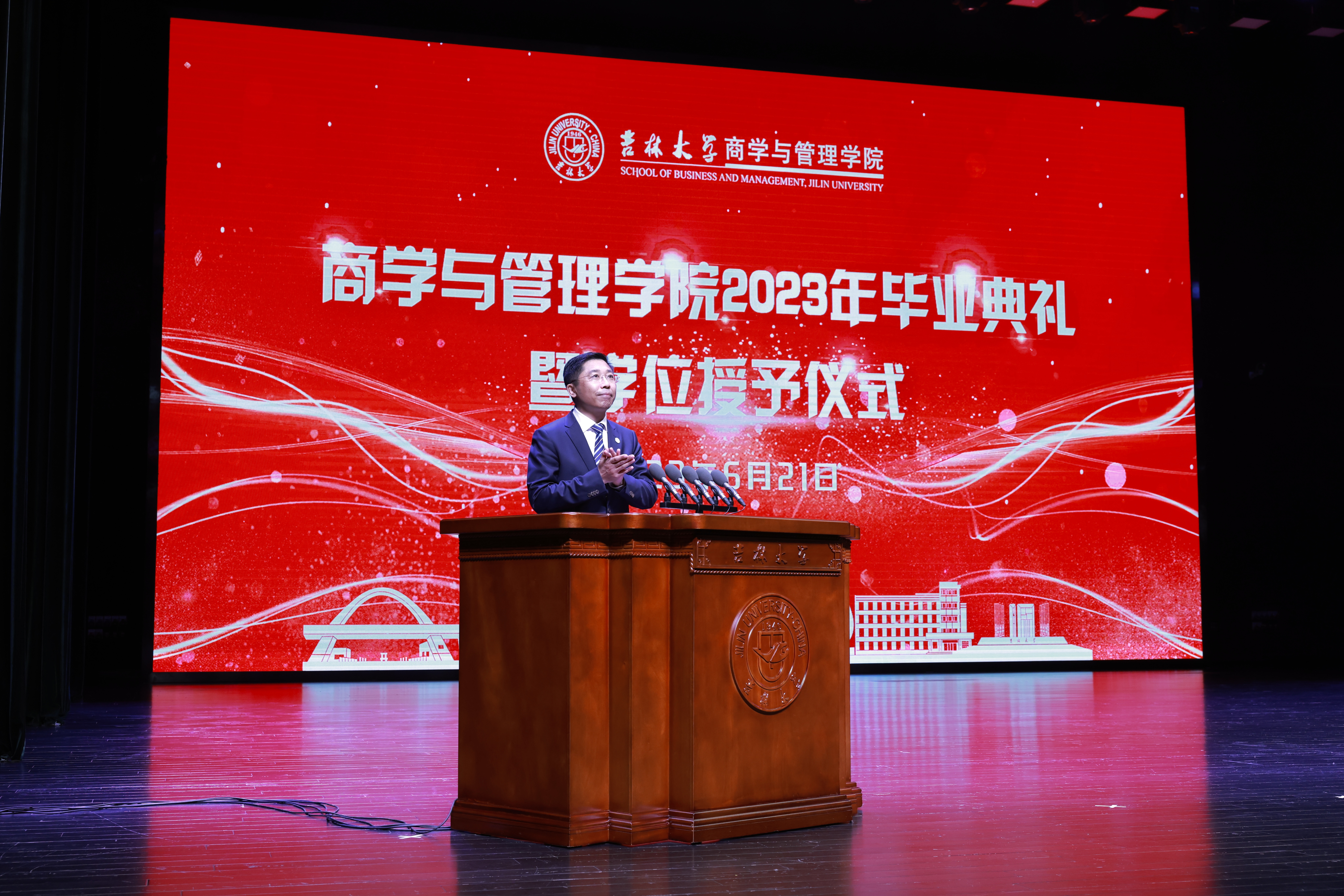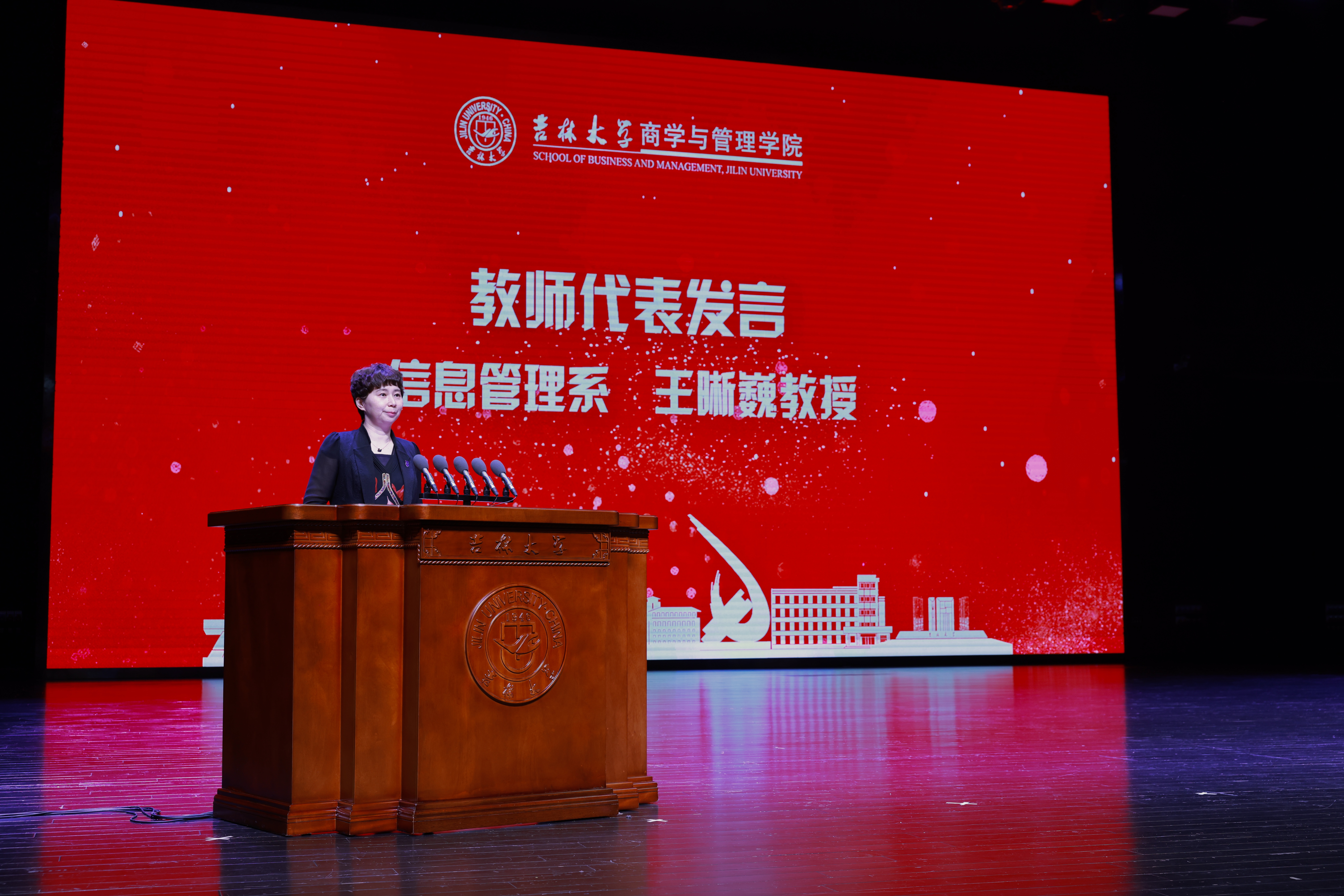 信息管理系王晰巍教授,作为教师代表进行了发言。王晰巍教授在发言中对毕业生们送上祝福:第一,希望同学们心有梦想,能勇立时代潮头。第二,希望同学们追求优秀,把勤奋作为习惯。第三,希望同学们终身学习,提升人生格局。最后,王晰巍教授祝愿吉大商管的学子们能够不断开创个人职业生涯发展的灿烂前程,不断为吉大商管学院争光,不断谱写国家发展和时代腾飞的辉煌篇章!