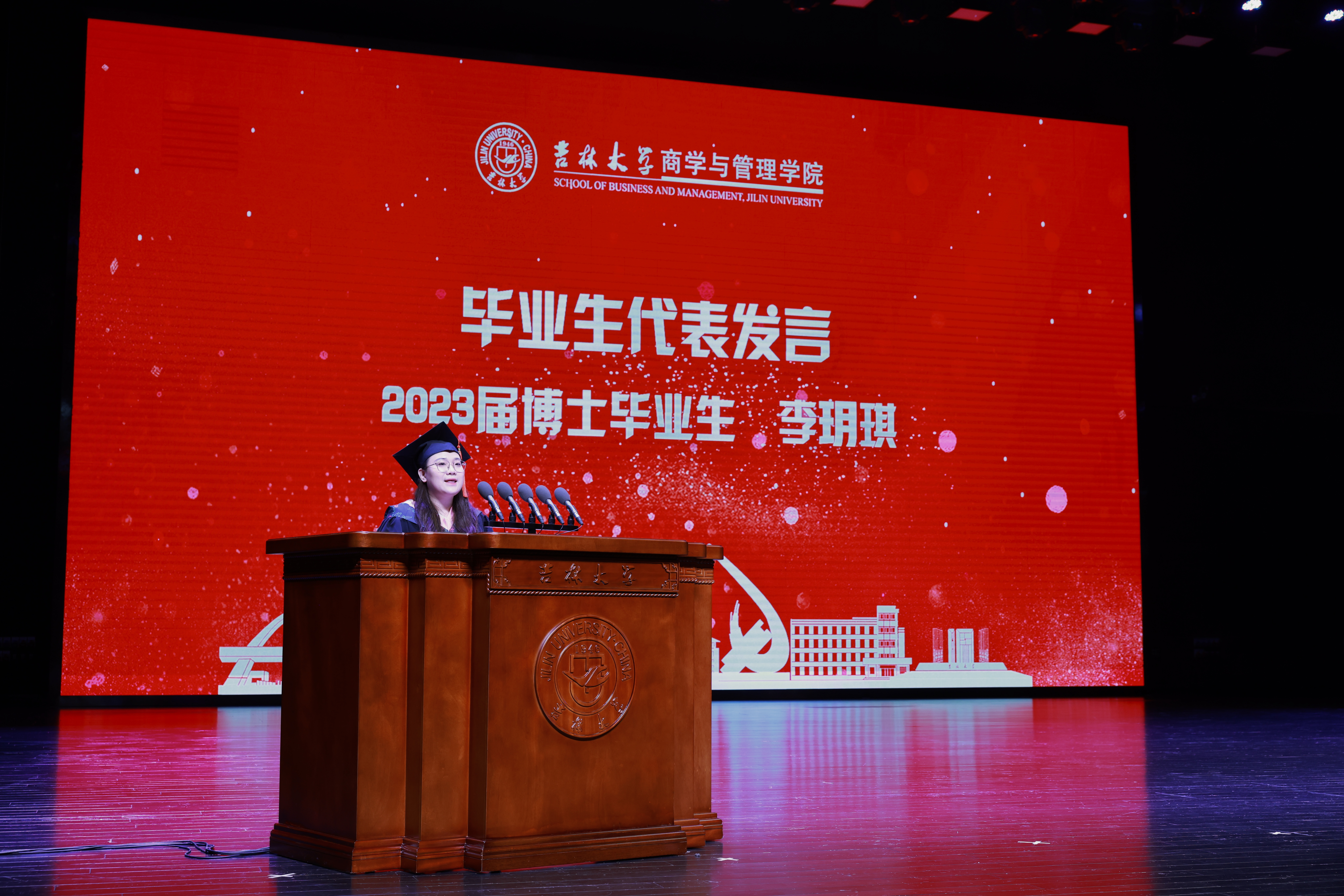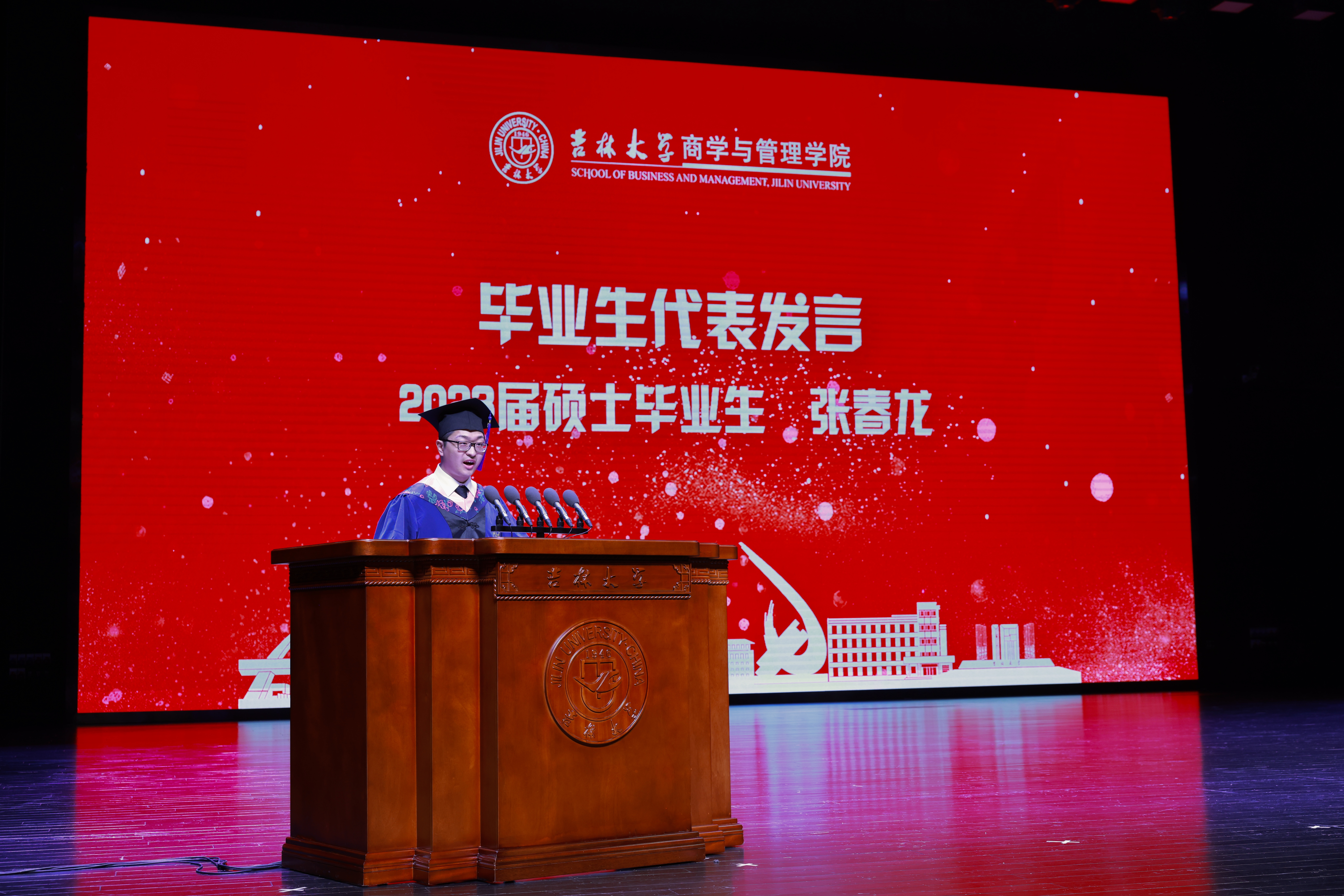 典礼上,往届毕业生代表、2022届财务管理本科毕业生王俊然进行了发言。王俊然同学回顾校园生活,深切表达了对母校的怀念与不舍,展望未来,她希望在以后的工作与生活中继续秉承吉大求实创新、励志图强的精神,砥砺前行。