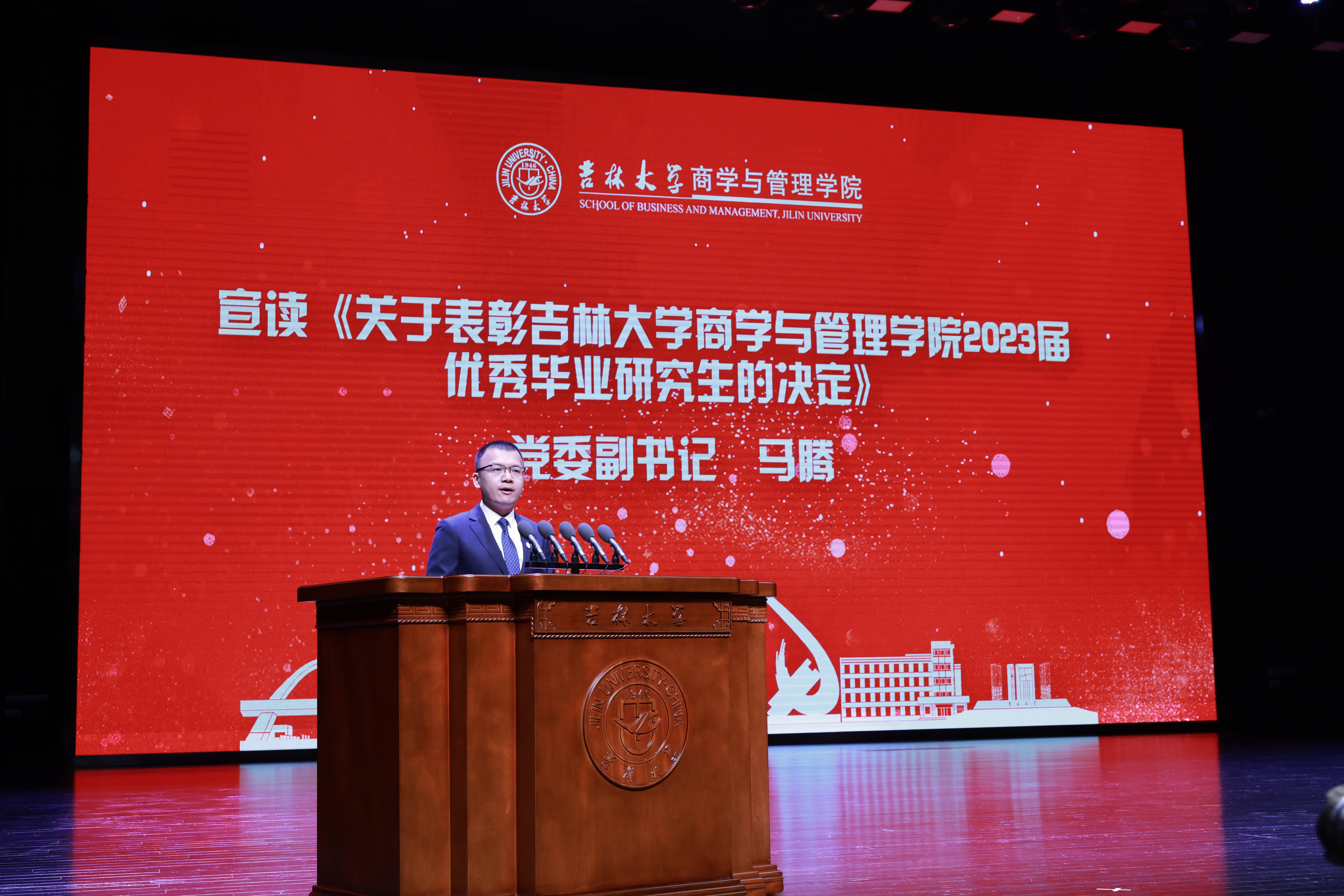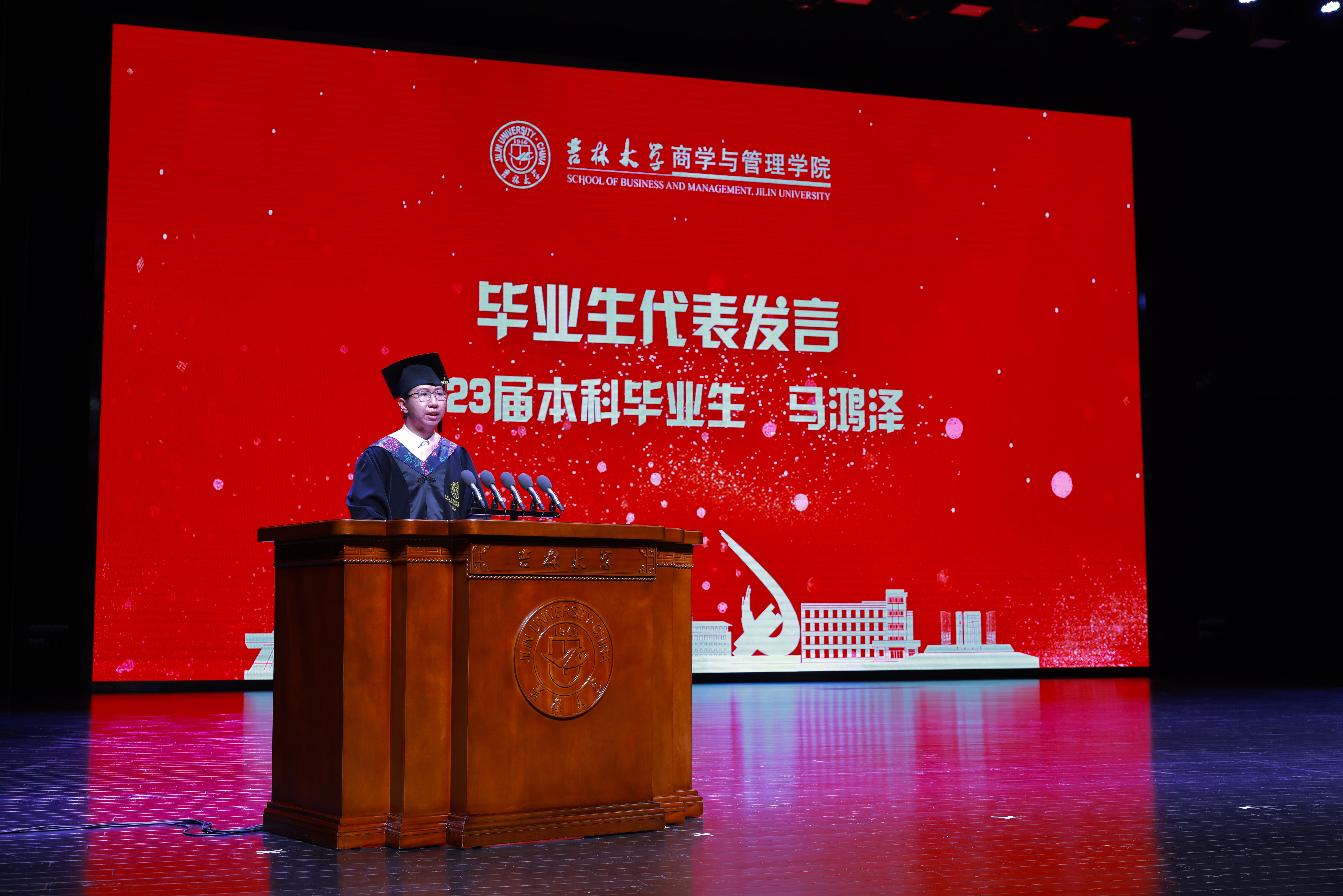 十佳大学生、2023届信用管理本科毕业生马鸿泽同学进行了发言。马鸿泽同学特别感谢了母校对自己的培养。身为党员,他强调“红”与“专”是吉大人身上永不磨灭的“根”与“魂”;面对未来,他提出将“求实创新”“励志图强”的吉大精神贯彻到学术与生活中去,潜心贯注创新科研,积极向上规划生活,不负时代,共创未来!