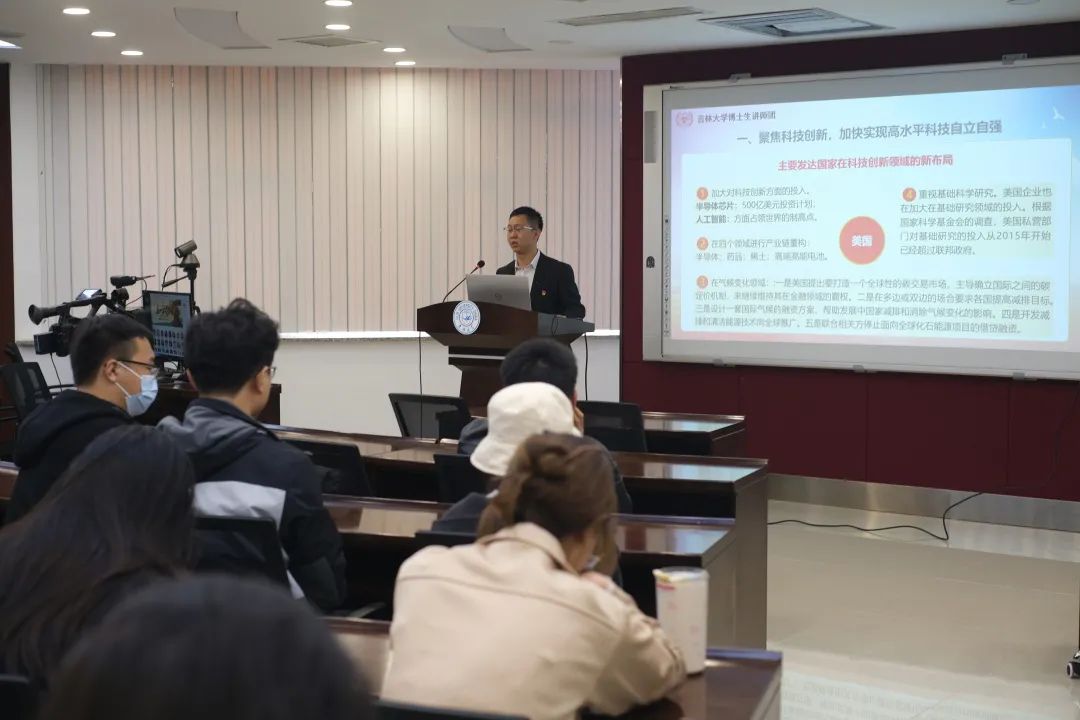 推动科技创新,人才是主体,蒋理从“用好人才资源,加快推动科技创新”的角度,对深入实施人才强国战略进行了详细的讲述,通过高水平人才队伍的建设,增强国家科技创新力。在宣讲最后,蒋理号召和鼓励大家在日常科研生活中要将学习贯彻习近平新时代中国特色社会主义思想,学习两会精神与贯彻落实党的二十大精神结合起来,立足科技创新,做好本职研究工作,为推动国家科技创新、加快实现高水平科技自立自强做贡献。本次理论宣讲有深度有温度有广度,加深了同学们对科技创新在推动高质量发展方面的认识。