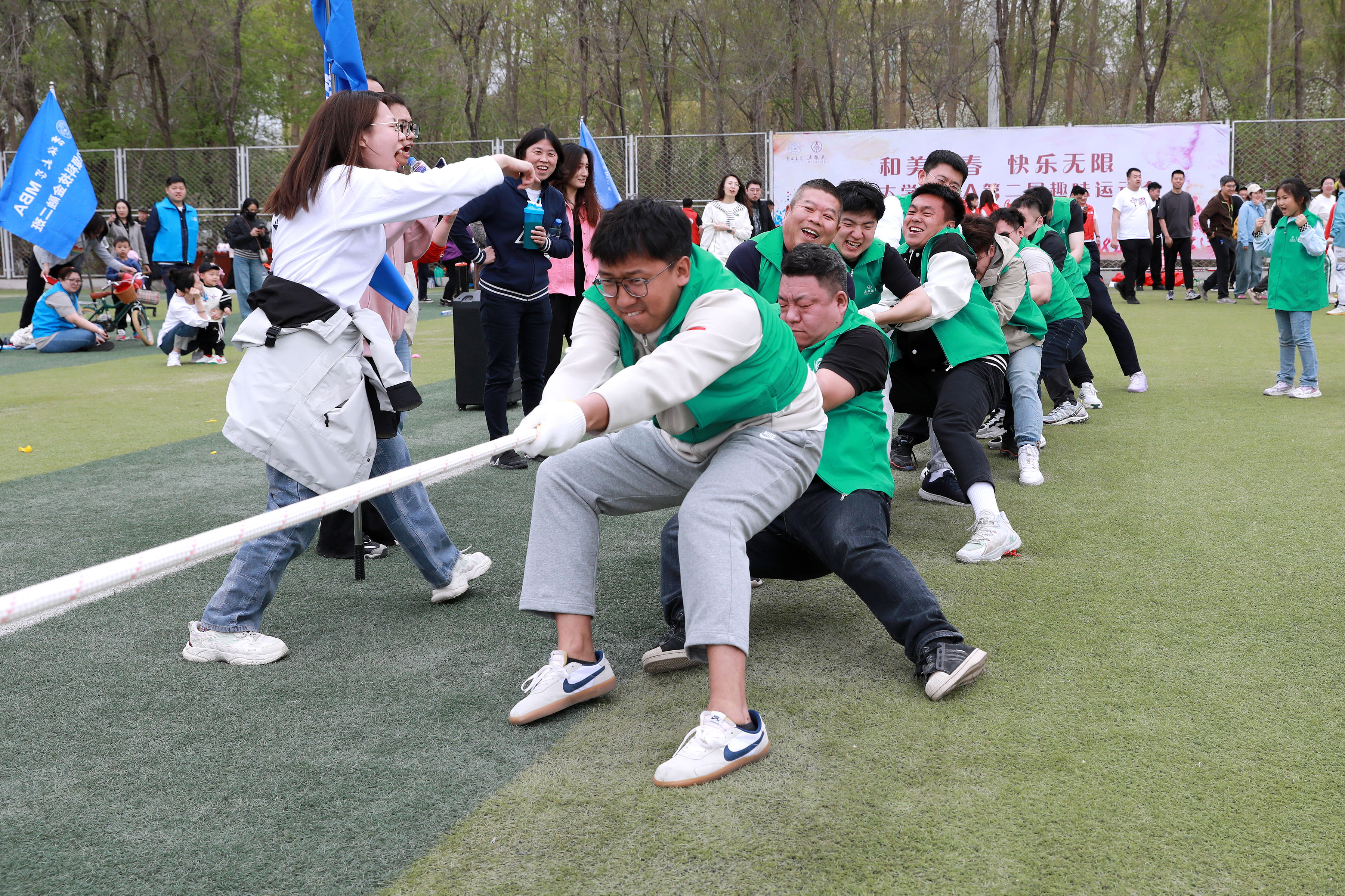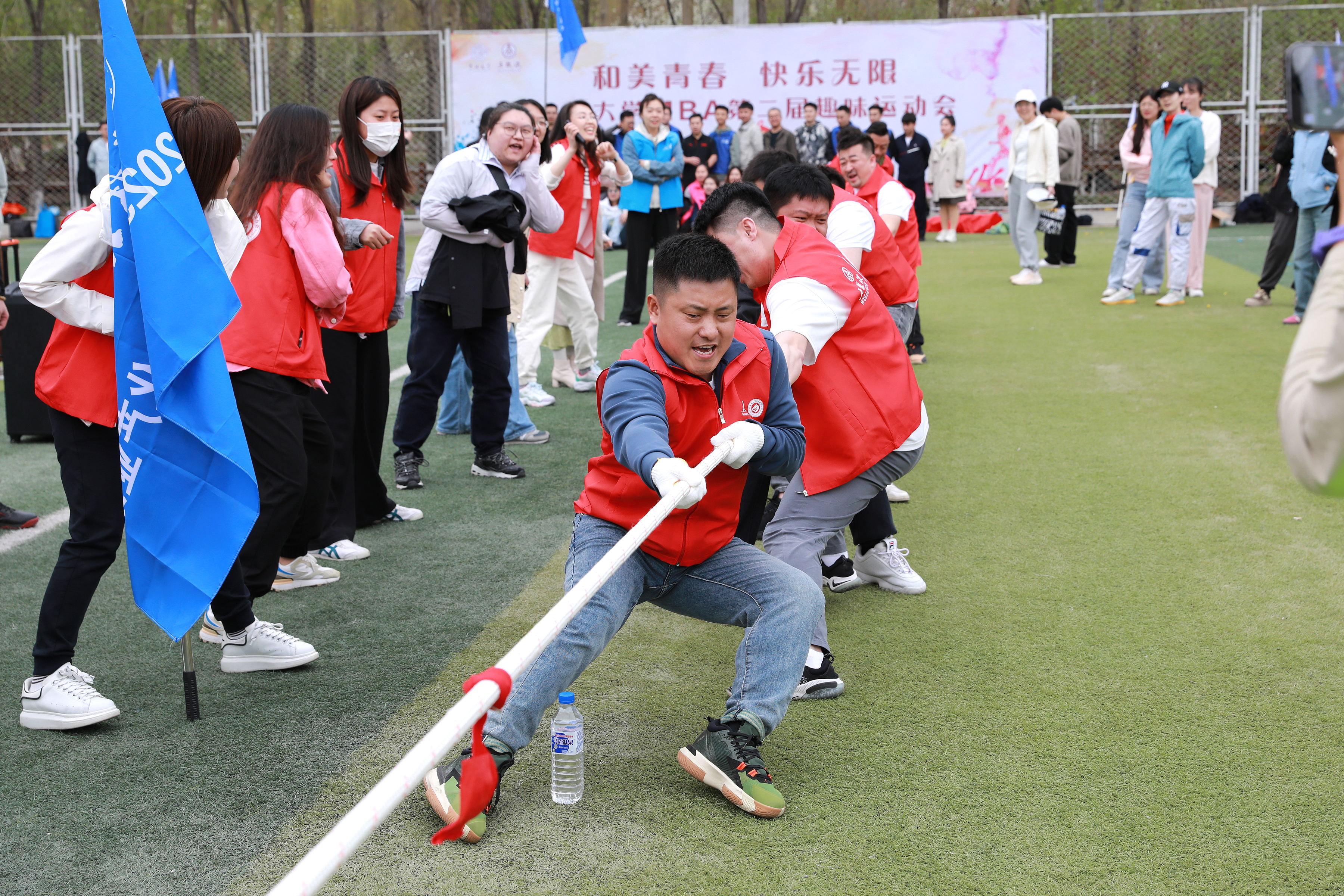 赵军书记亲自为拔河比赛开哨且担任裁判。随着哨声响起,只见各班级的参赛选手们紧握长绳,双脚紧蹬地面,身体后倾,使出浑身解数。他们有的紧闭双眼,有的咬紧牙关,有的憋红了脸,展现出了不屈不挠的拼搏精神。绳子在两队之间来回移动,场面一度十分胶着。观众们的心也随之紧张起来,加油声、呐喊声此起彼伏,为选手们鼓劲。经过几轮激烈的较量,最终胜利者脱颖而出,他们的欢呼声、喝彩声响彻云霄。