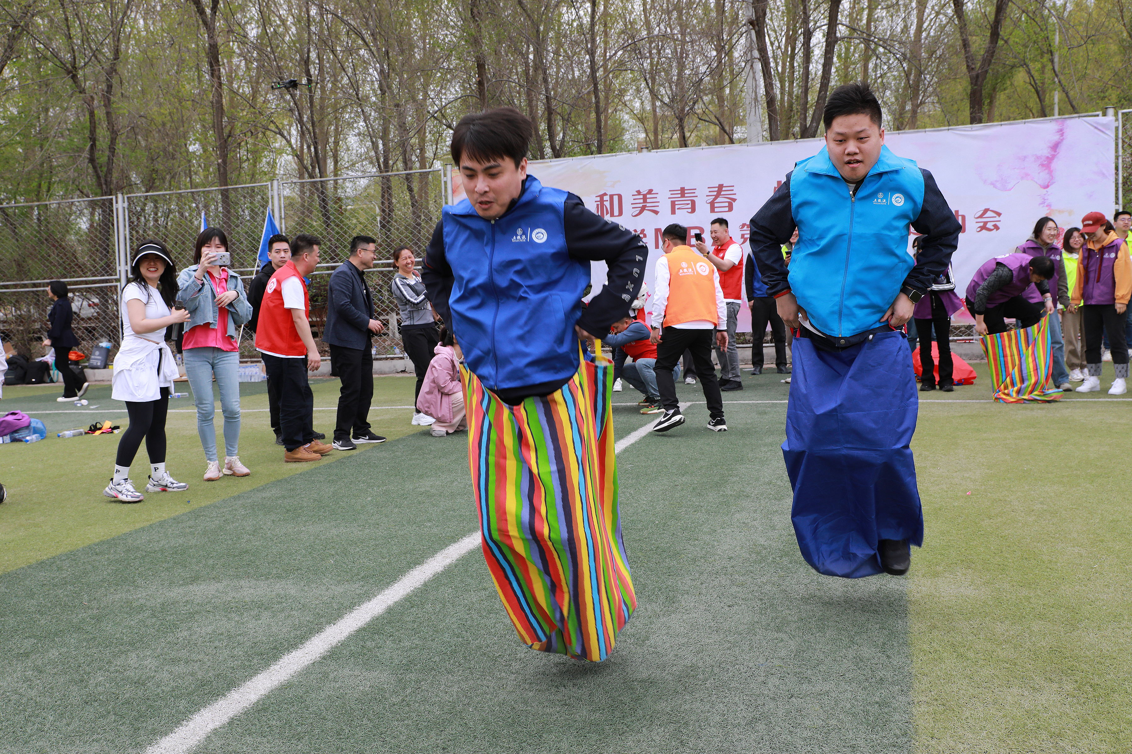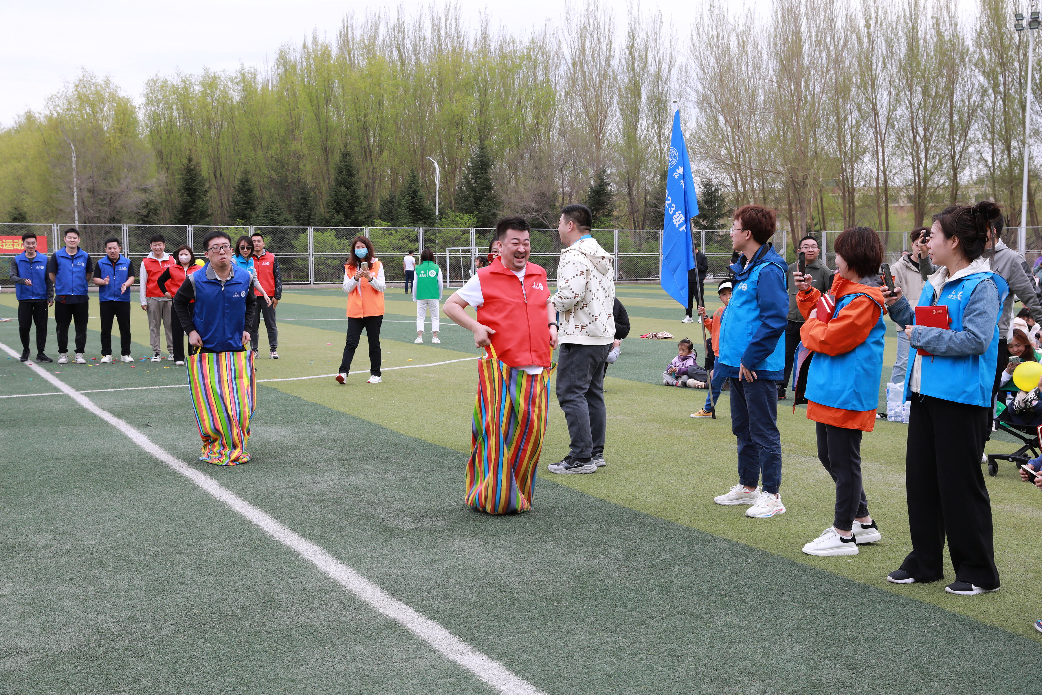 “袋鼠跳接力”更是将比赛推向了白热化阶段。选手们身着麻袋,犹如一只只活泼可爱的袋鼠,在赛场上跳跃前进。他们奋力向前,争分夺秒,每一次跳跃都凝聚着团队的力量和信念。最终,随着最后一组选手冲过终点线,整个赛场沸腾了,掌声、欢呼声此起彼伏,回荡在绿茵场上空。