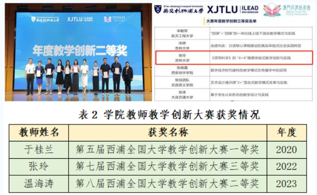 学院以人才培养为中心,发挥国家级高水平师资在本科教学中的作用,将优异的学科资源和科研资源转化应用于本科教学,发挥教师主观能动性,积极鼓励教师创新课堂教学,及时将最新的科研成果投入到课堂教学和学生指导工作中。2020年以来,我院三位教师获得西浦全国大学教学创新大赛奖项。