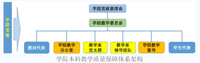学院通过明确质量标准、建立监控机构、完善质量制度、动态实时管控,建立和落实教学质量保障体系。构建“学院党政联席会—教学委员会—基层教学组织与师生”的三级教学质量保障体系,教学质量保障架构在学院党委的领导下行使功能。