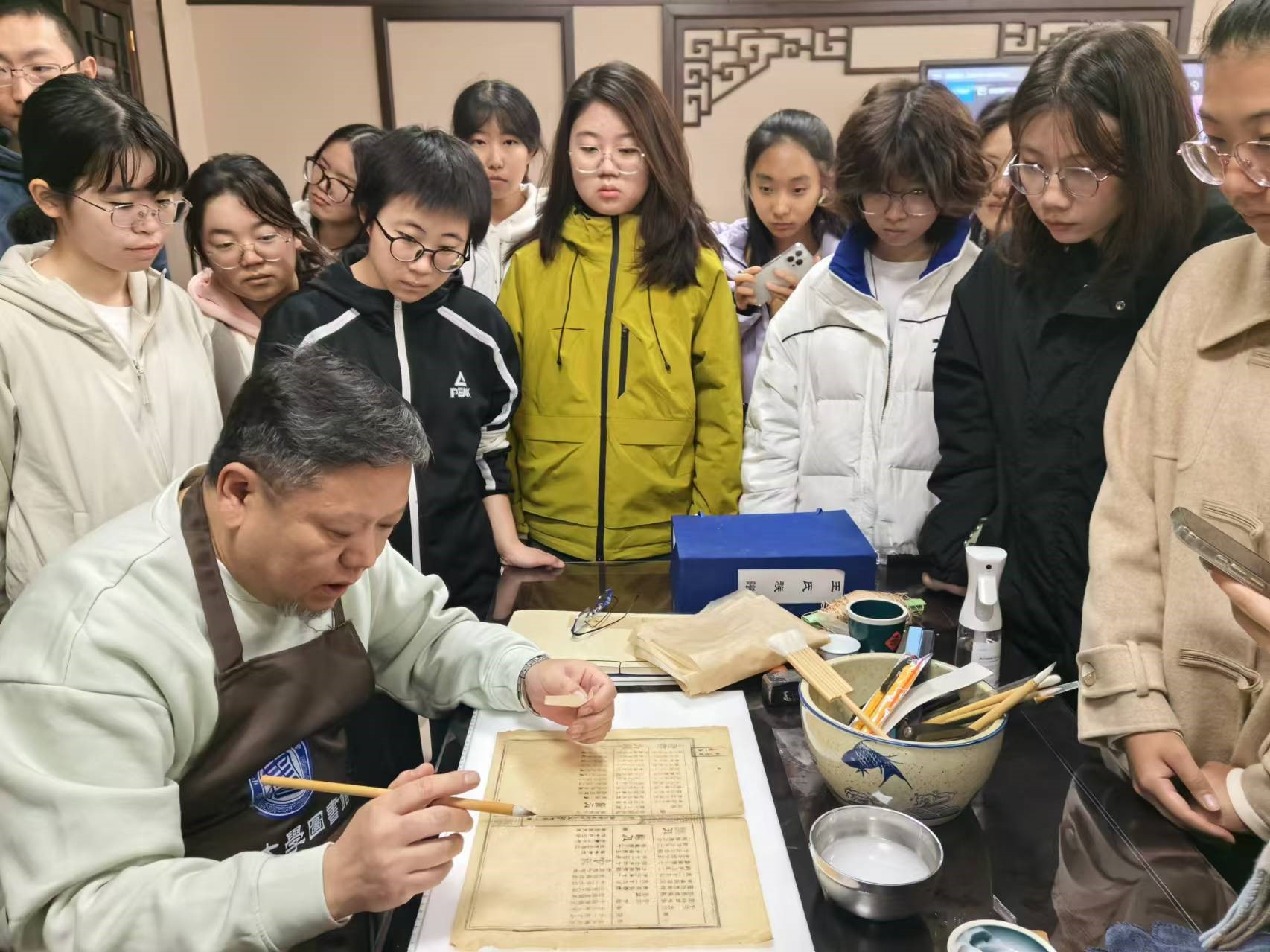 中心图书馆六楼古籍修复中心进行古籍档案修复实践活动。本次活动吸引了60余名学生参加,P站