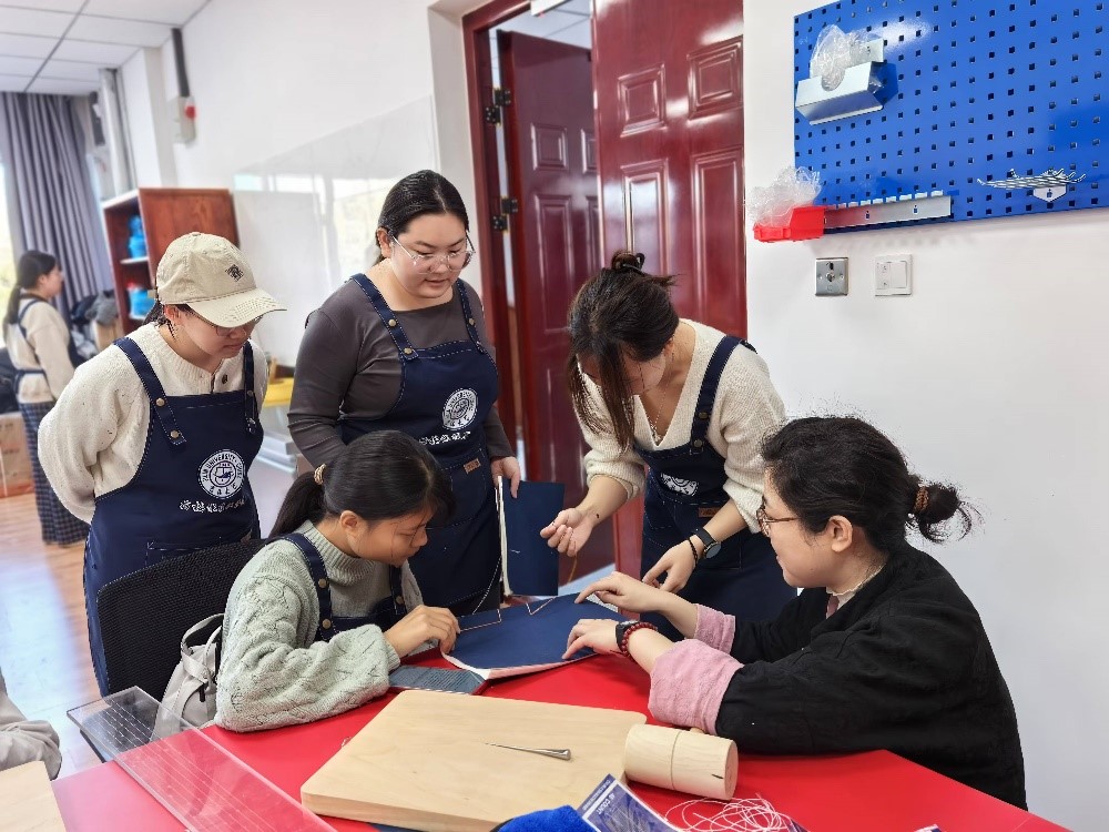 信息管理系主任邓君教授、王阮副教授以及宋懿老师予以指导。本次活动共有20名学生参加。张奇老师亲自示范拓片制作与古籍装订步骤。拓片制作演示时,现场伴随着短促有力的捶打声,石雕图案缓缓浮现在坚韧的树皮纸上,仿佛历史的印记被一点点唤醒。线装书装订从 “绵软无力”的白宣纸对齐,到裁纸时用好巧劲,再到穿线时牢记繁琐的走向,无一不体现了精雕细刻之匠心。学生以饱满的热情积极参与到操作实践中,不仅学到了古籍装订以及拓印技艺,同时更体悟到了中华优秀传统文化传承的责任使命。