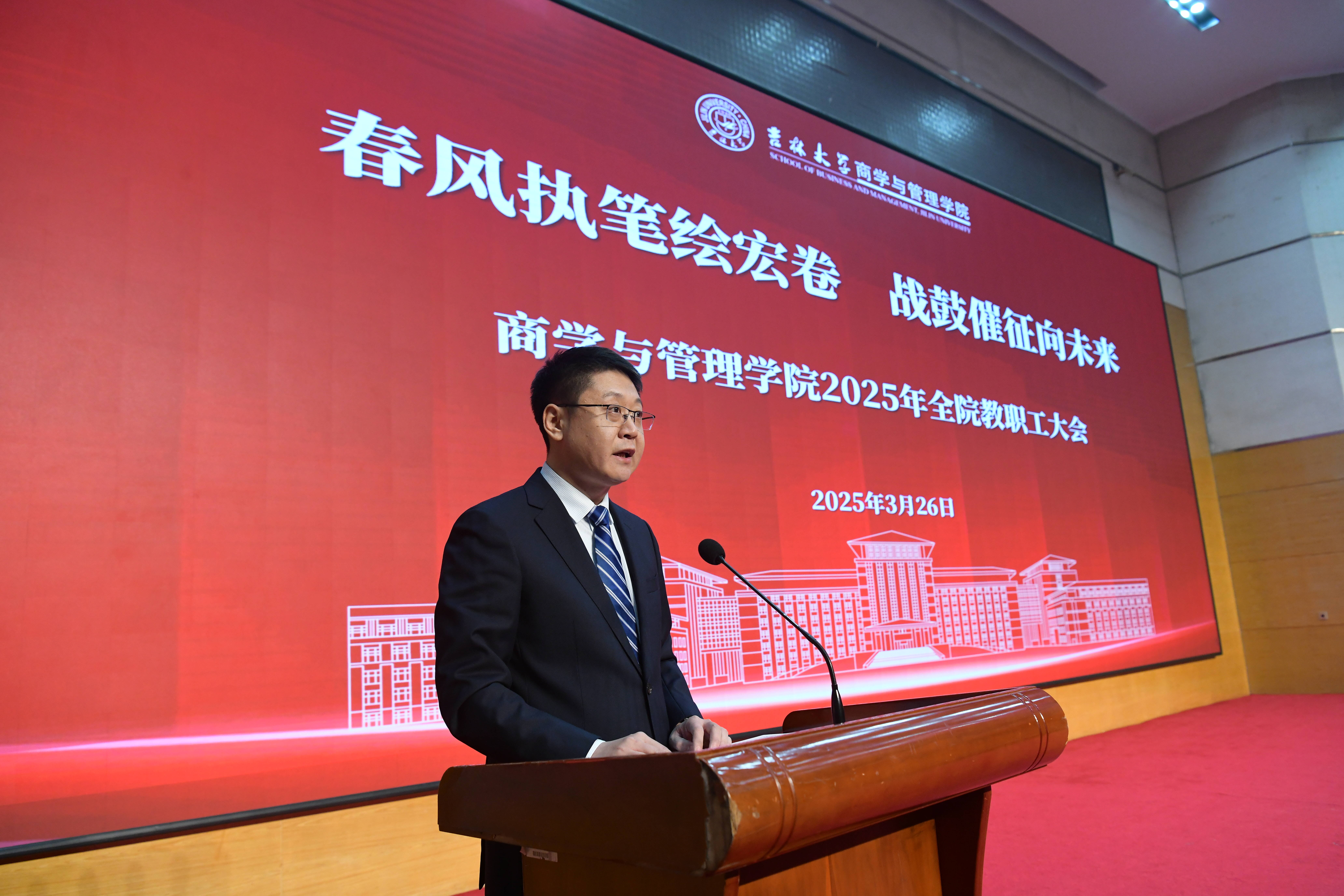 院长蔡立东教授对会议进行了全面总结。他对学院过去一年取得的成绩给予了充分肯定,对2025年的具体工作进行了强调部署。蔡校长指出:建设“有为商管”需要始终坚定奋斗方向,一马当先“争上游”;需要始终扭住奋斗关键,一以贯之“重合作”;需要始终保持奋斗情怀,一如既往“提士气”;更需要始终紧盯奋斗目标,一丝不苟“促发展”。商管人回首过去,是在用“赶考”之心向历史致敬;商管人展望未来,更是在用“赶考”之行对历史负责。希望全体商管人以“六个坚持”为引领,回答好“商管何为”,以“四个重点”为突破,建设好“有为商管”。