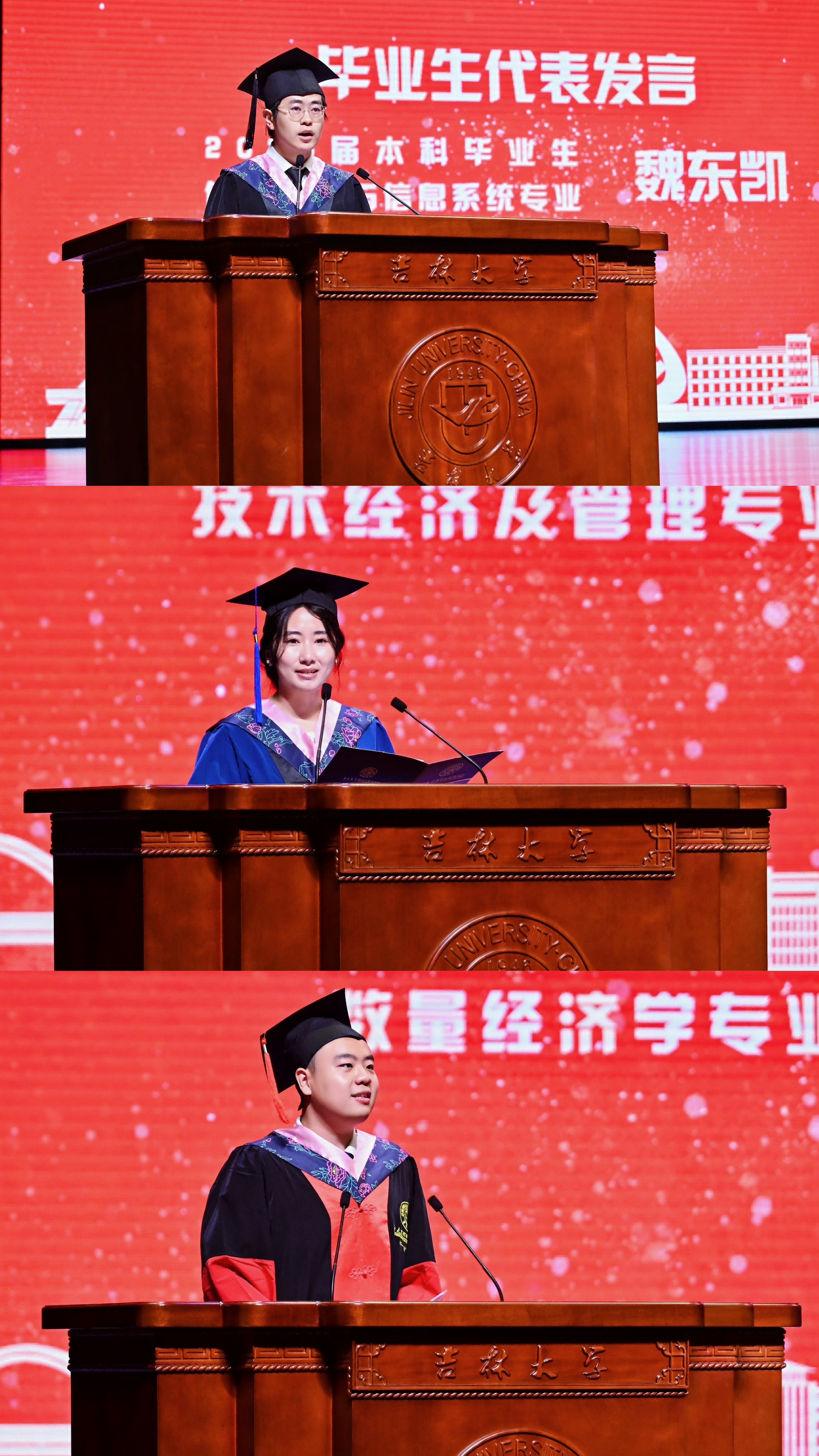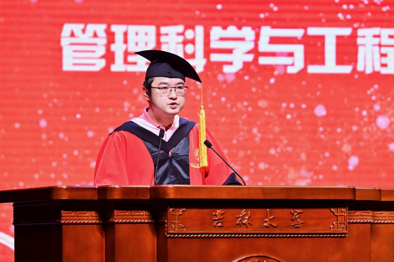 典礼上,本科毕业生代表魏东凯、硕士毕业生代表高盼、博士毕业生代表郝一哲依次发言,他们讲述了自己自强自立、勤学笃行的求学经历,分享了求学期间的感人故事,用支教兴边的实际行动表达对母校和学院的感激之情,并承诺将传承吉大人“求实创新,励志图强”的校训精神,在时代舞台上以青春之力诠释责任担当,为理想信念不懈拼搏,不负学院的教诲和嘱托。