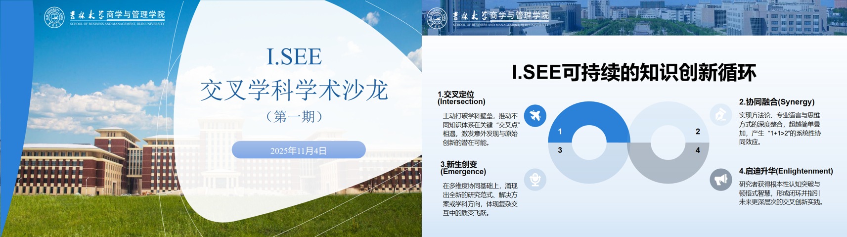 114日,我院成功举办首期“I.SEE交叉学科学术沙龙”,聚焦跨学科思想碰撞与实质性合作探索。沙龙由常务副院长隋建利教授主持,党委书记赵军教授、副院长王金明教授全程参与。来自工商管理、应用经济学、信息资源管理、管理科学与工程四个学科的青年教师齐聚一堂,围绕“I.SEE框架”I - Intersection (交叉)S - Synergy (协同)E - Emergence (新生)E - Enlightenment (启迪))展开深度对话。