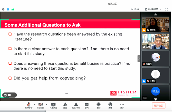 Dr. Wanxiang first introduced the core components of academic writing, inviting the audience to share their opinions on which components are most important. He also shared how different journals focus on different priorities in different steps of the review process. Next, Dr. Wan discussed the theoretical motivations and empirical motivations that define what an interesting topic is with examples from his own research. Finally, Dr. Wan shared some tips on how to publish in international journals and answered questions from the audience.