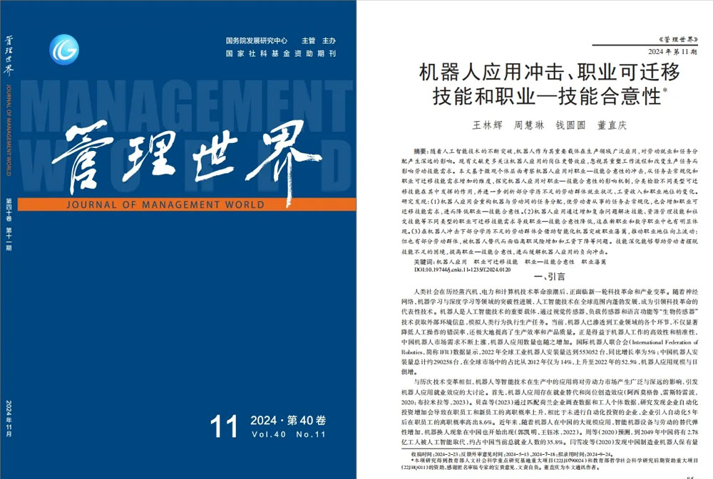 数量经济研究中心王林辉教授与华东师范大学经济与管理学院博士生周慧琳、安徽农业大学经济管理学院钱圆圆副教授、浙江财经大学管理学院董直庆教授的合作论文“机器人应用冲击、职业可迁移技能和职业—技能合意性”发表于《管理世界》2024年第11期。