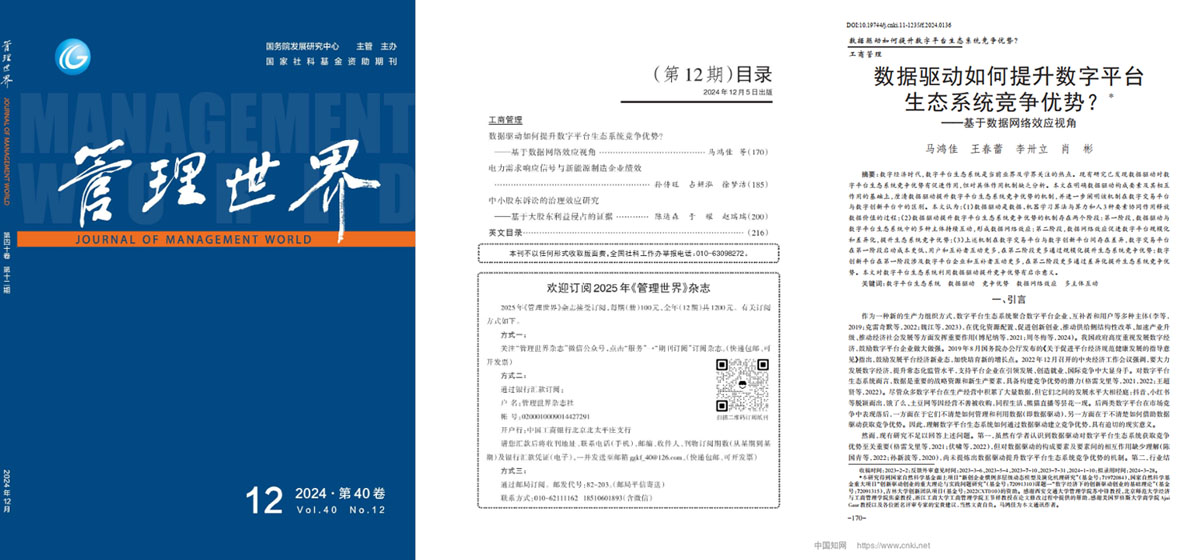 马鸿佳教授等在《管理世界》2024年第12期发表题为《数据驱动如何提升数字平台生态系统竞争优势?——基于数据网络效应视角》的文章。该文紧扣数字经济时代数字平台生态系统如何利用数据建立竞争优势这一关键问题,基于数据网络效应理论和数字平台生态系统管理实践提出研究命题,并构建了数据驱动提升数字平台生态系统竞争优势的机制模型。