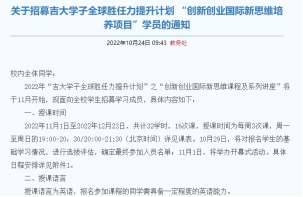 发布《关于招募吉大学子全球胜任力提升计划 “创新创业国际新思维培养项目”学员的通知》。