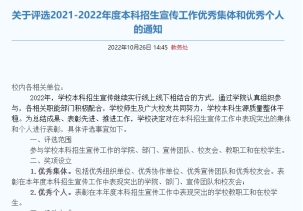 发布《关于评选2021-2022年度本科招生宣传工作优秀集体和优秀个人的通知》。