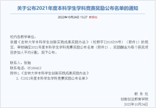 本科学生创新实践成果奖励办法》的规定,审核确定2021年度本科学生学科竞赛奖励公布名单。