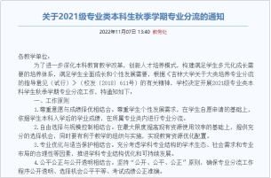 开展2021级专业类本科学生秋季学期专业分流工作。学校成立专项工作组,坚持尊重意愿与成绩择优相结合、自由选择与规模控制相结合、专业优化与适当保护相结合、公平公正与公开透明相结合的工作原则,按流程、按标准开展专业分流工作,构建满足学生多元化成长需要的培养体系,满足学生全面成长和个性发展需要。
