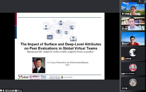 董龙珠教授带来的讲座题目是“国际虚拟团队中成员互评的偏见”,这是董教授在“虚拟团队”方面为学生们带来的新颖而有意义的分享。董龙珠教授首先为学生们介绍了成员互评正在逐渐代替上级和下级的评价的趋势背景,以及成员评价与成员国籍之间联系的发现。在此基础上,董龙珠教授向学生们抛出了“国际虚拟团队中绩效评估如何随时间变化”的问题,并围绕此问题,从研究背景、过程和结果,详细完整地介绍了有关内容。在董教授分享过程中,最开始的提问也得到答案。