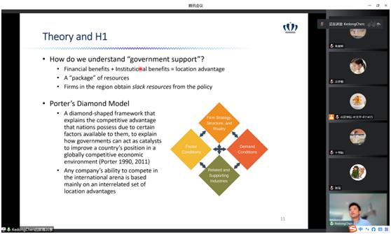 管理科学与工程学科的老师和硕博研究生们在线参与了本次讲座。陈珂栋副教授介绍了他的研究——政府支持对城市创新的影响,并以自己的论文为例,向在线的硕博研究生介绍了双重差分法在研究中的实际应用。陈老师的讲座以总结各国政府对企业创新行为政策的相关现状开始,介绍了全球的发展中国家以及发达国家对于企业创新行为的重视与支持,以及中国、印度、日本、美国等出台的各种鼓励创新的相关政策。进而引出待研究问题——创新对于企业本身的重要影响,但是国家发布的创新政策是否会影响企业在海外的表现,以及如何影响企业在海外的创新行为尚不清楚。