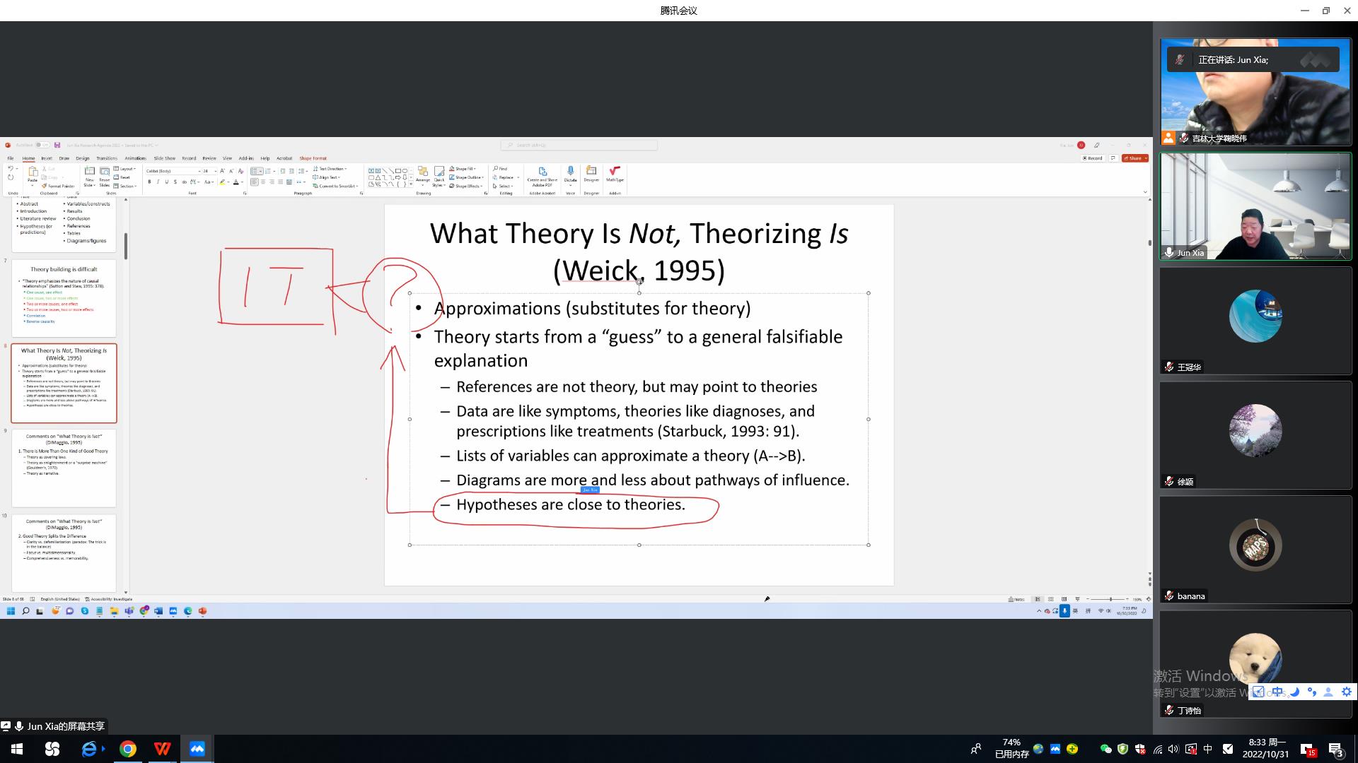 第二场讲座题目为“Theory and empirical test”。本次讲座围绕“Theory construction as social construction”的主题展开。夏军教授以具体论文为例,介绍了理论应该具备如下的特征:“covering laws”“enlightenment”、“narrative”,这样才能够更加吸引读者。此外,夏军教授还认为好的理论应该具有“clarity vs defamiliarization”“focus vs multidimensionality”“comprehensiveness vs memorability”“the value of resonance”、“slogan”“post hoc”等特征,并围绕每种特征一一展开了讨论。