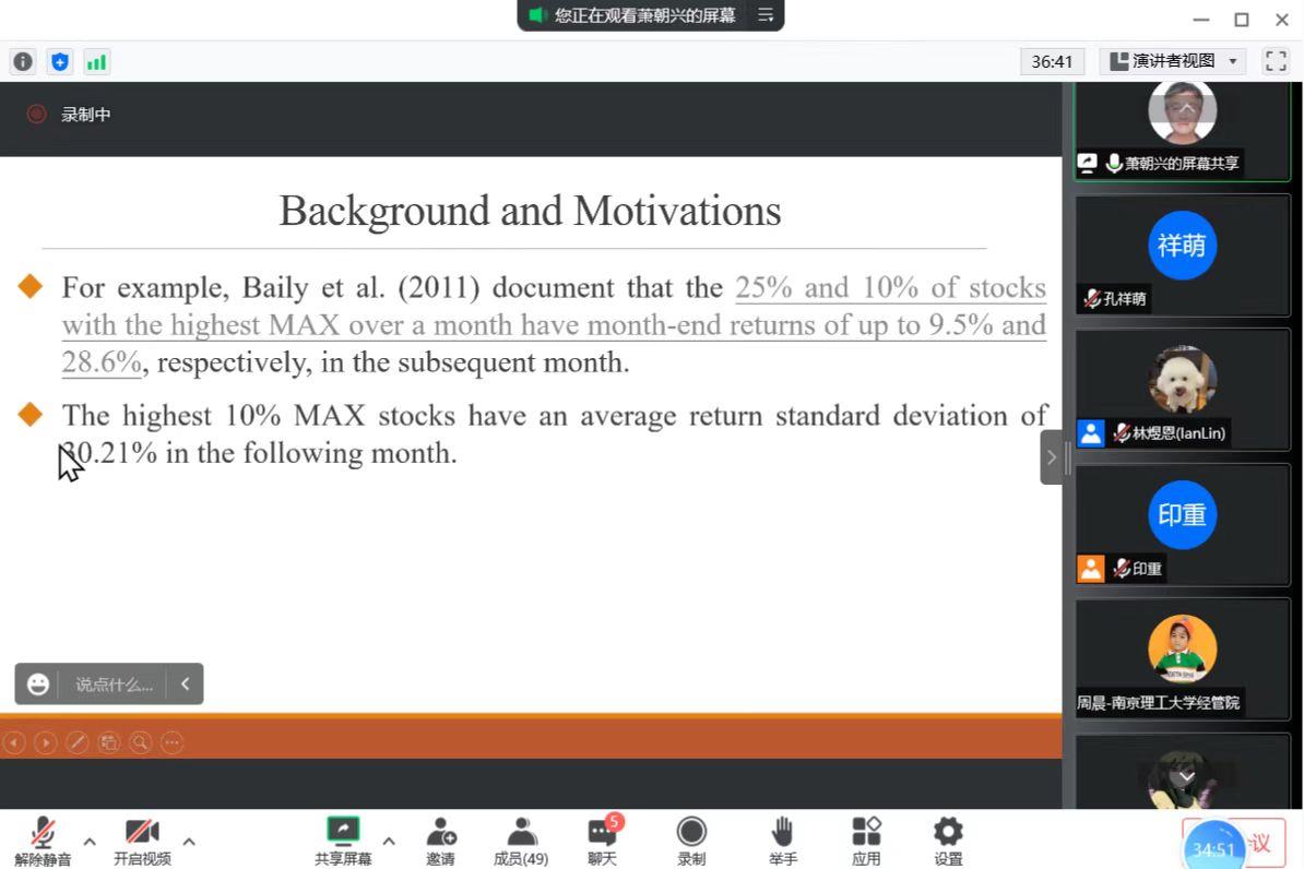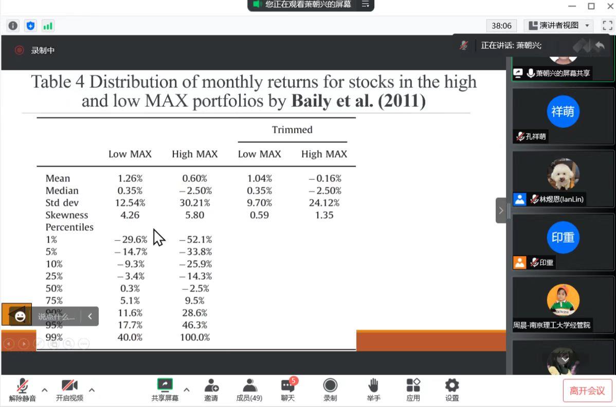 海外学者系列讲座第24场如期举行,本次讲座由财务管理系承办,邀请到了台湾东华大学管理学院萧朝兴教授对近期的研究成果“Is Investing in Lottery-Like Stocks Really Unprofitable?”进行分享。讲座由林煜恩副教授主持。受疫情影响,本次讲座在线上进行,P站