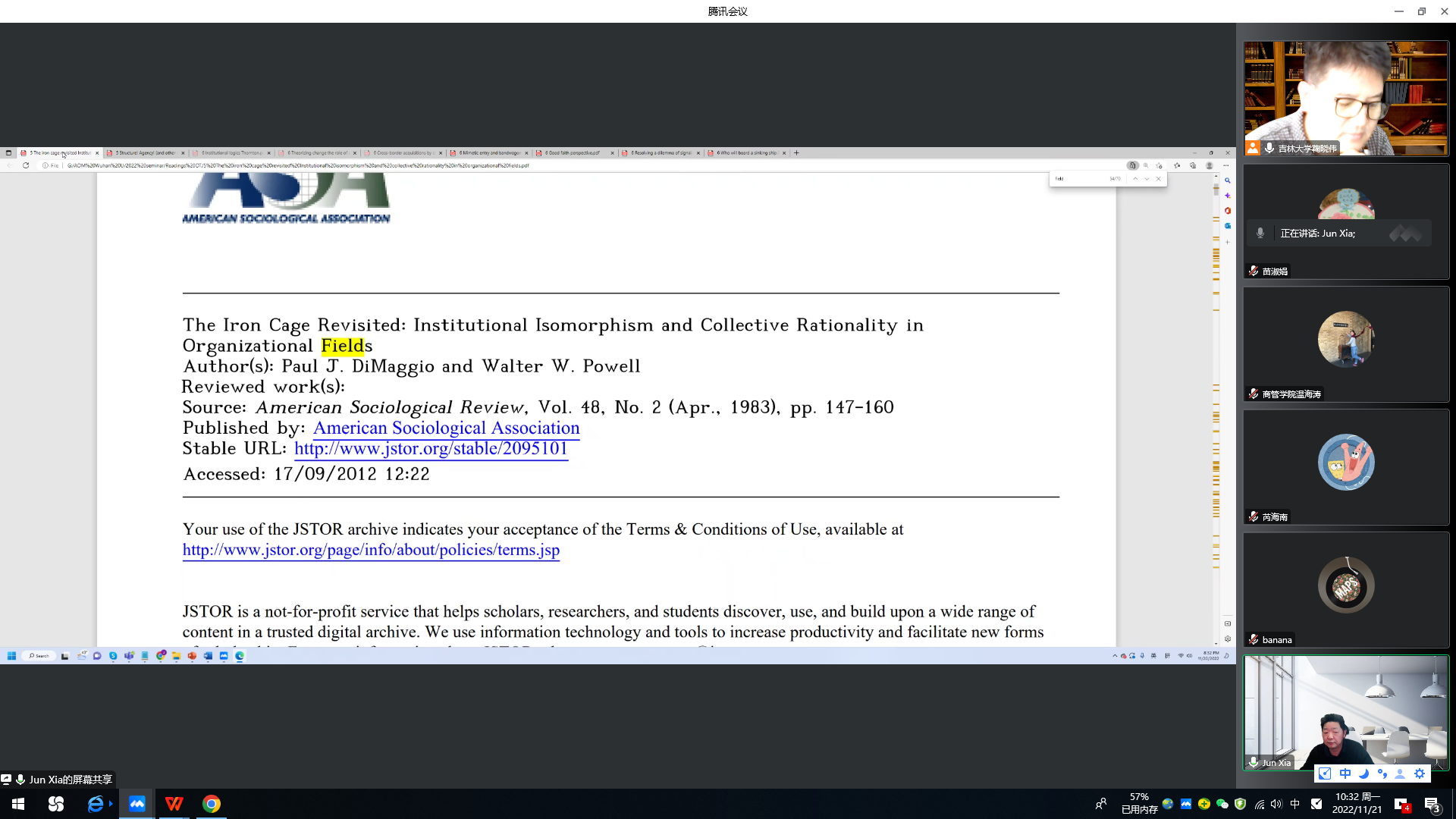 第一场讲座题为“Institutional theory: isomorphism”讲座。讲座主要围绕“Institutional theory: isomorphism”的主题展开。首先,夏军教授介绍了制度理论的来源,以及制度化组织的含义,即采用外来结构要素的组织。文章中常见的Formal structure也是采用外来某种方式的组织。比如,Rationalized institutional rules是组织采用其他组织的惯例,然后使其成为合法性的一部分,对外部显示出它是合理的。此外,检验制度理论需要检验数量sheer number。例如,以Tolbert和Zucker(1983)这篇文章为例,在Diffustion的过程中,如果企业强行采用,那么过了40年,制度化会达到100%;如果企业自愿采用,那么过了50年,制度化会达到60%。在社会现代化过程中,也会产生很多新的制度要素,企业也会采用这些要素。比如,中国私有制的diffusion。最后,夏军教授介绍了制度改革的六个阶段:precipitating jolts、deinstitutionalization、pre-institutionalization、theorization、diffusion和re-institutionalization。