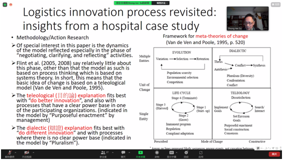 苏教授以自己所做的一篇研究Logistics innovation process revisited: insights from a hospital case study为例,详细介绍了该行动研究的起源、与产业合作的契机、开展实践行动的过程、以及与理论对话形成论文的全过程。该研究起源于对在职研究生毕业论文的指导,在两年的实践中,苏老师结合学生所在的医院存在的物流问题进行创新实践,这个过程是以物流创新理论为指导,并在应用中实现了对该理论的发展,最终论文发表在物流与供应链领域的重要期刊上,并获得了当年的最佳论文。