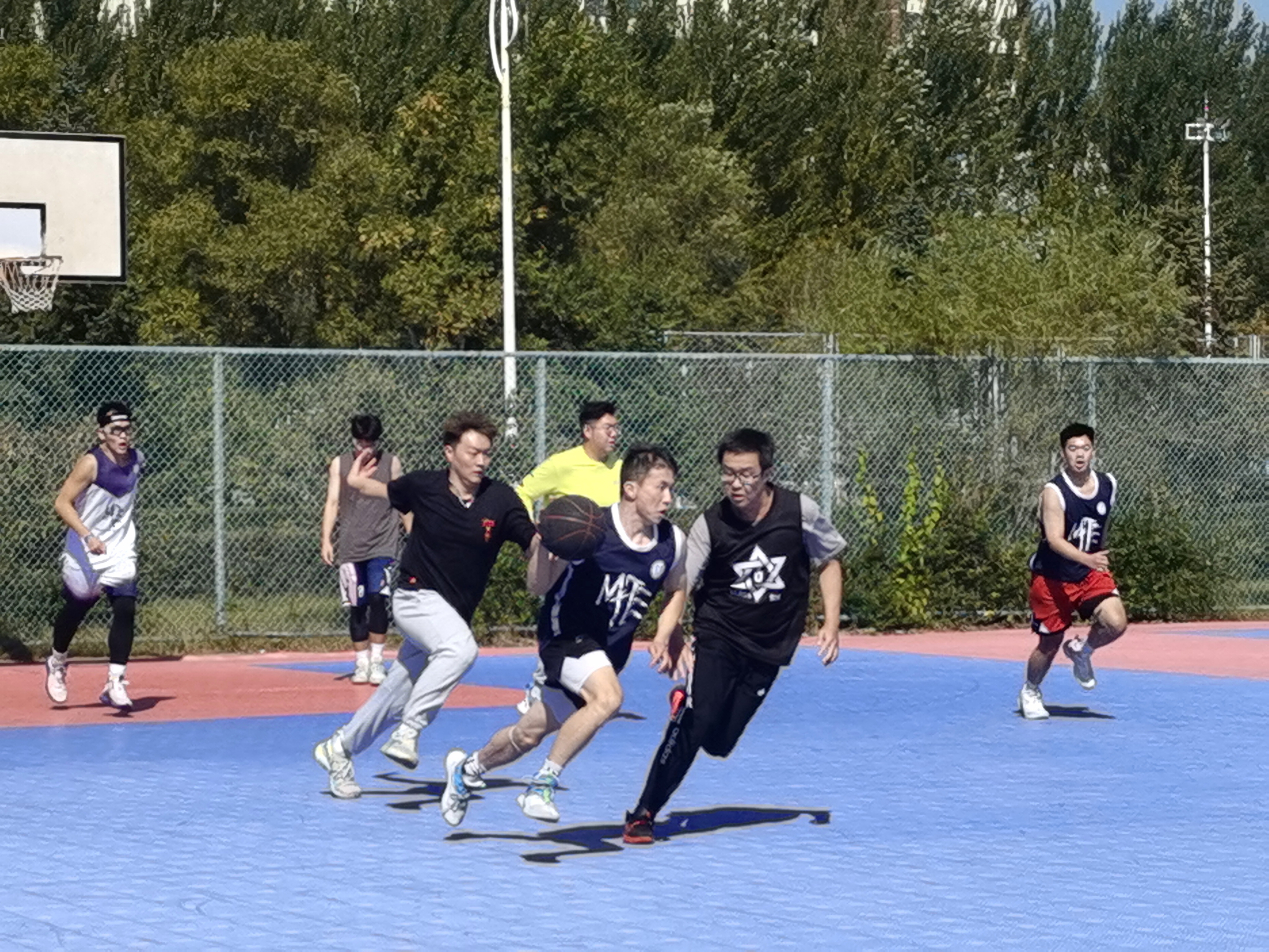篮球赛要求同届组队,每队8至9人。各年级同学积极响应,纷纷组成球队,共有13支新老生组成的队伍参与到比赛当中。篮球场上,双方队员你争我夺,或攻或守,不放过每一个得分的机会,力争进球,赢得比赛。9月24日下午,经过多场激烈的角逐,最终有四支队伍进入了第二天的决赛。当天下午4时,篮球场上还组织了一场女子篮球赛,姑娘们身着队服,斗志昂扬。她们配合默契,控球游刃有余,运球、传球、卡位、穿插、抢断、快攻、上篮、投球,动作帅气利落,赢得了现场观众的阵阵掌声与喝彩,展现了巾帼不让须眉的飒爽英姿。