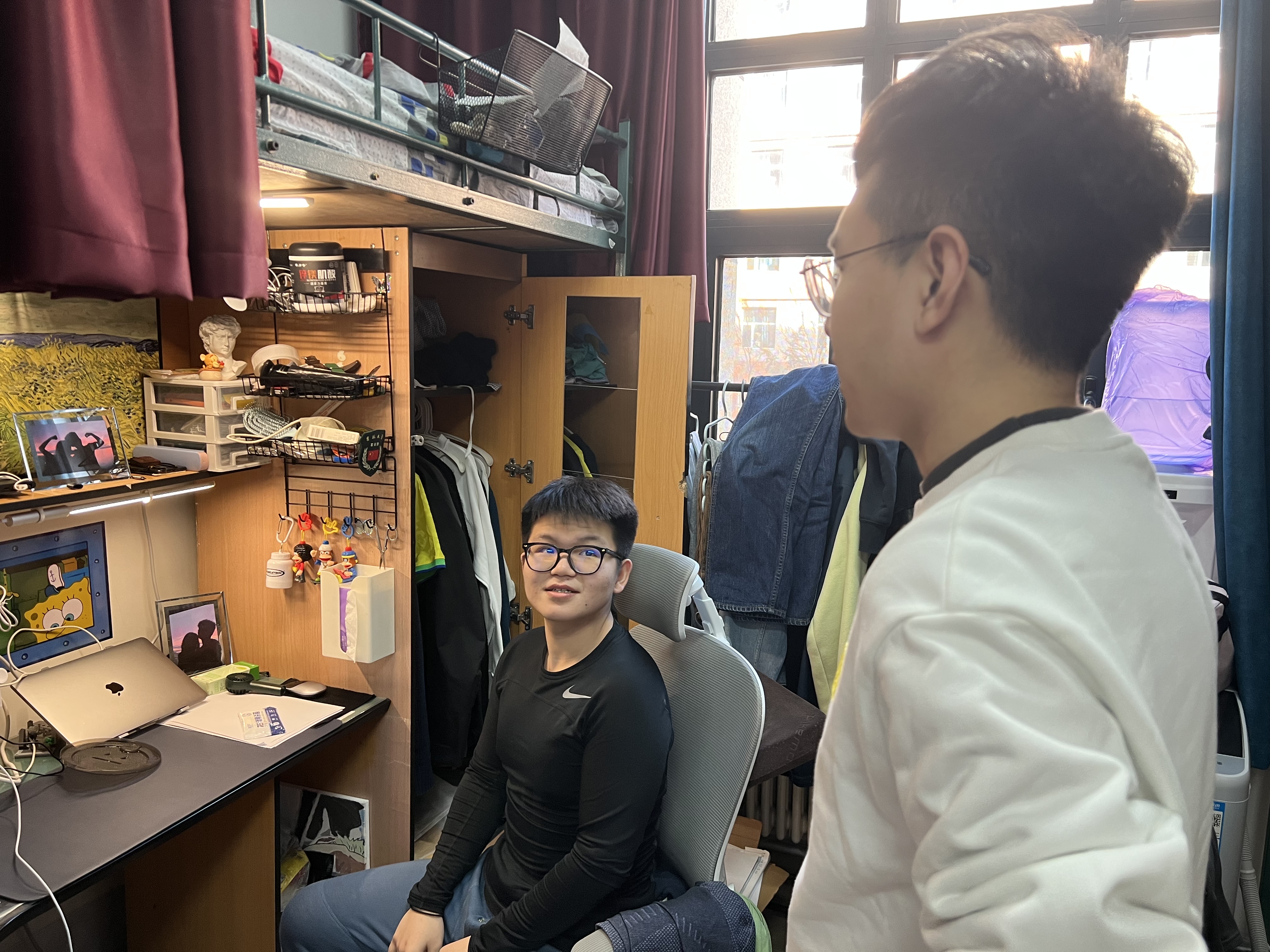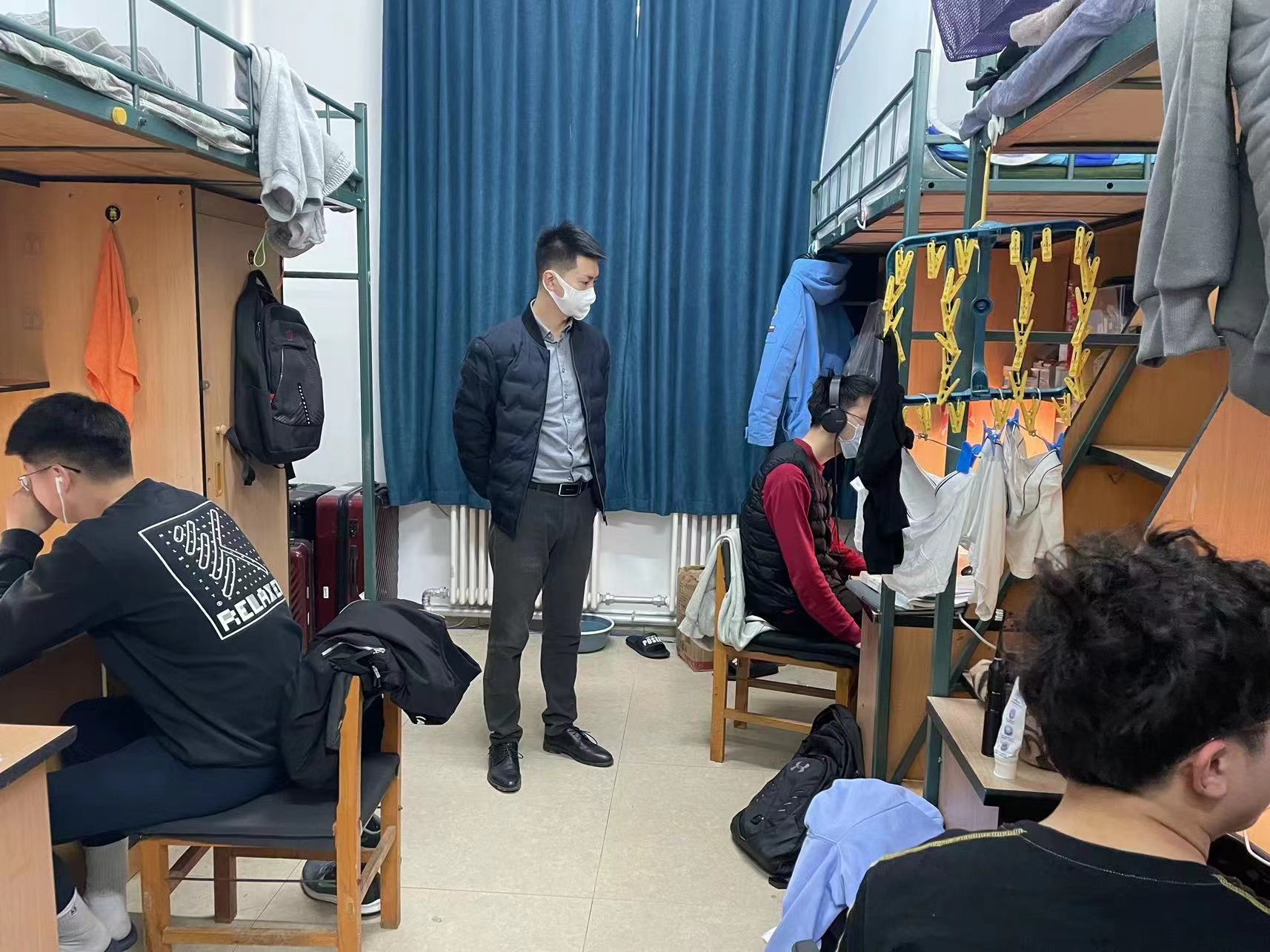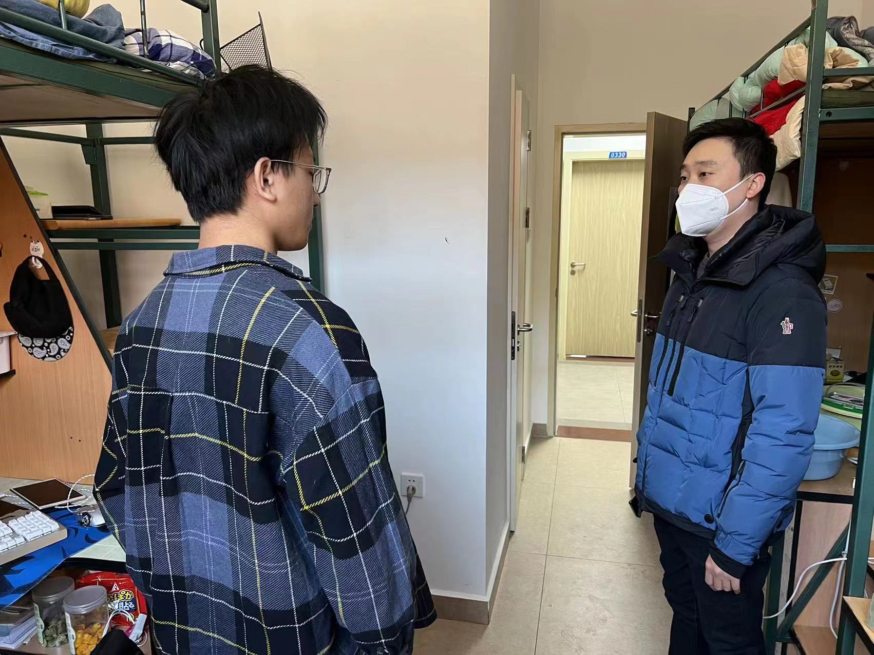 2019级辅导员陈卓、刘翔宇,2020级辅导员刘天目、禚传阳,2021级辅导员丁越及2022级辅导员李毓、贾奇达走访学生寝室,进一步了解同学们学习生活情况和思想状态。