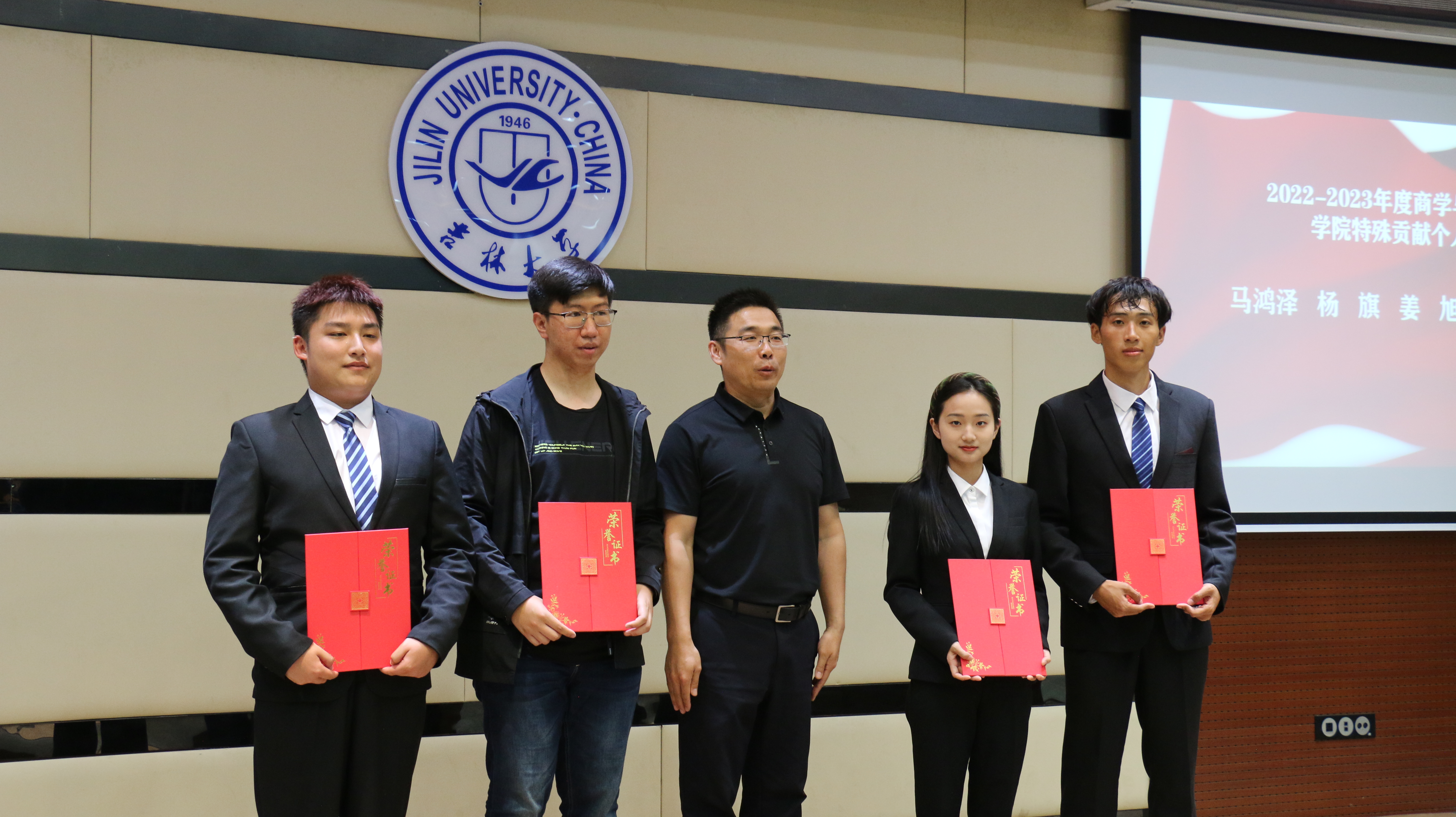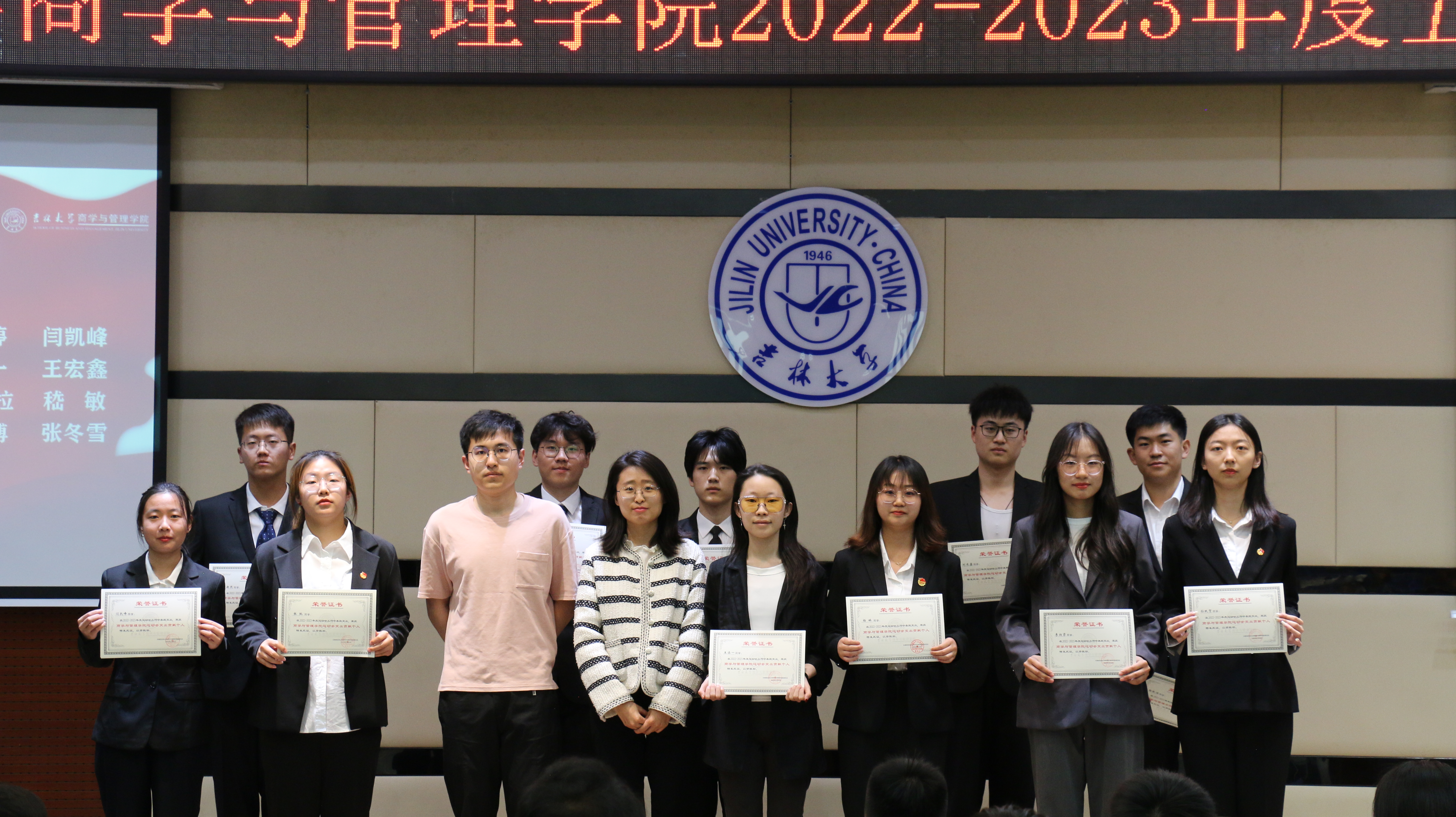 大会第四项,由学生办公室主任兼2021级辅导员丁越老师宣读表彰决定,他特别肯定了同学们的辛勤付出,为各位获奖的同学送去鼓励与祝福,并希望他们能再接再厉,助学院团学工作更上一步台阶。大会第五项,主持人宣读获奖学生名单,各位老师依次上台,亲自为表彰学生们颁发证书。同学们怀着愉悦的心情踏上颁奖台,与颁奖老师一起合影留念,每个荣誉的瞬间,都被永远定格在学院的记忆之中。