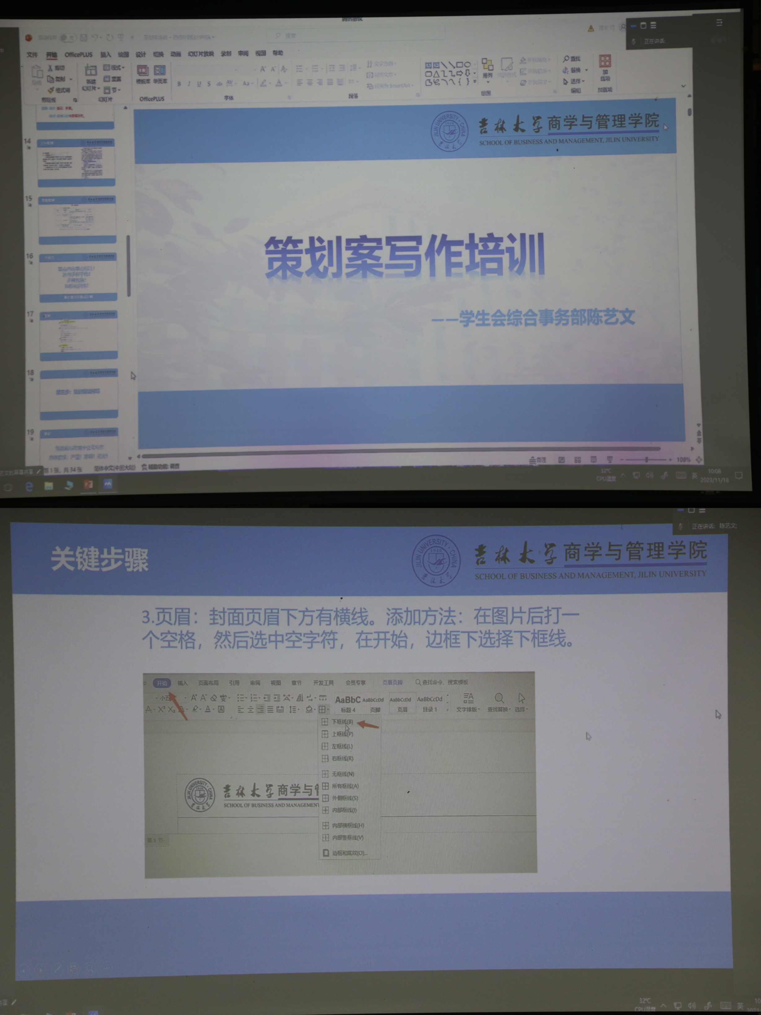 随后,由学生会综合事务部陈艺文讲解策划案的撰写,因陈艺文同学身体抱恙本部分于线上进行。陈艺文同学以什么是策划案、策划案写作注意的内容与策划案如何写这三个步骤展开。陈艺文同学强调,作为团学组织应严谨且周密的把握各方面因素,如策划案内容简单明了、排版整齐美观、活动具体时间地点、各种文字与表格的搭配等,以确保活动的顺利进行。