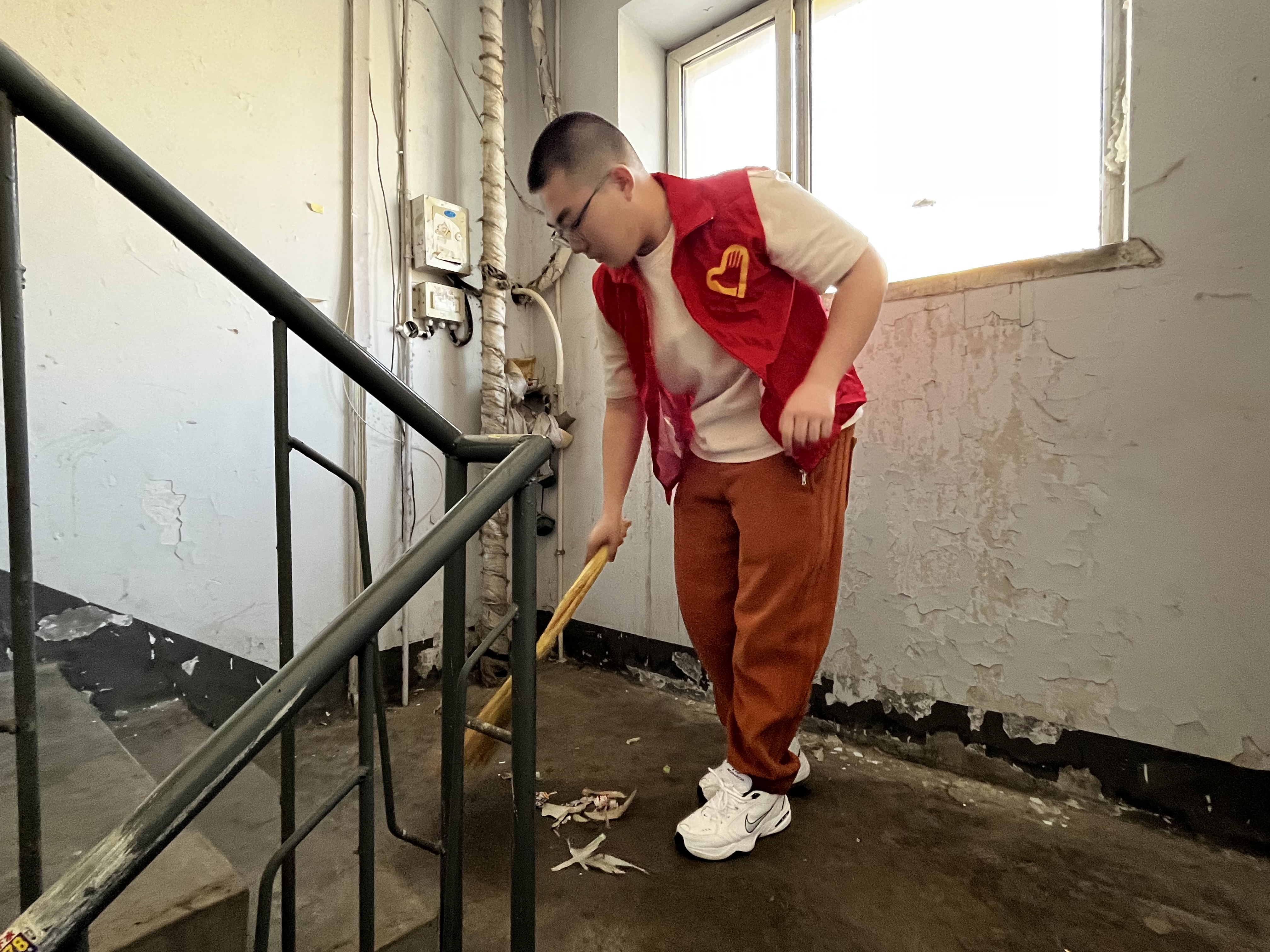 2024年3月4日下午1点钟,志愿者们在湖畔北门停车场集合后乘坐大巴前往建工社区。一点半抵达建工社区后,红旗街道建工社区书记安爽热情接待志愿者们,耐心详细地介绍了志愿服务活动的任务——深入社区清理楼道中的小广告以及邪教宣传内容。了解清楚任务后,志愿者们立即行动起来,拿上扫把和小铲子,两两一组清理小广告,楼道墙壁、扶手、住户家门上牛皮藓似的小广告在同学们热火朝天的热情下很快被清理干净,建工社区居民楼的楼道在志愿者们的劳动中焕然一新。