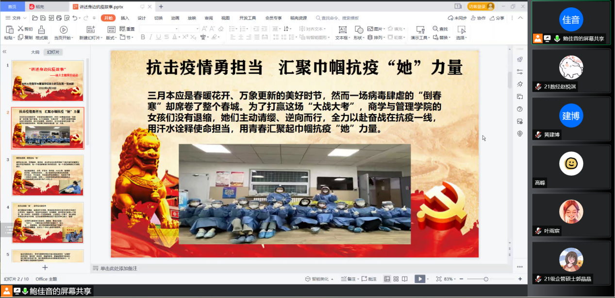 活动的第二部分主要讲述了我们学院甄宓、裴月莹、梁玉芳三位女老师和170名巾帼志愿者的抗疫情故事:为了打赢这场“大战大考”,P站