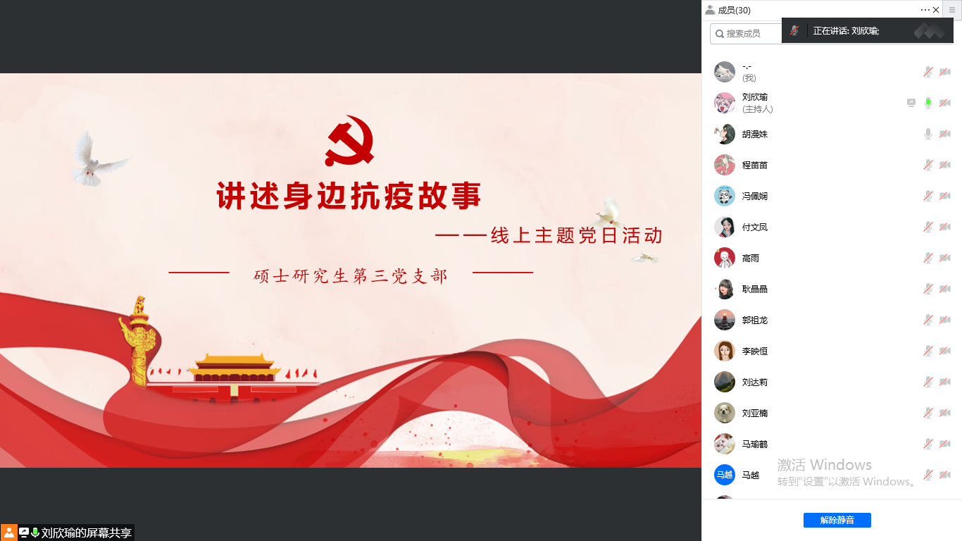 师生的抗疫事迹。接着,南苑八公寓a区楼长徐斌同志通过三个剪影为大家分享了他身边的抗疫故事,表达了对在抗疫过程中做出贡献的党员师生的感激和感动之情,也表达了对积极配合抗疫工作的同学们的感谢之情。
