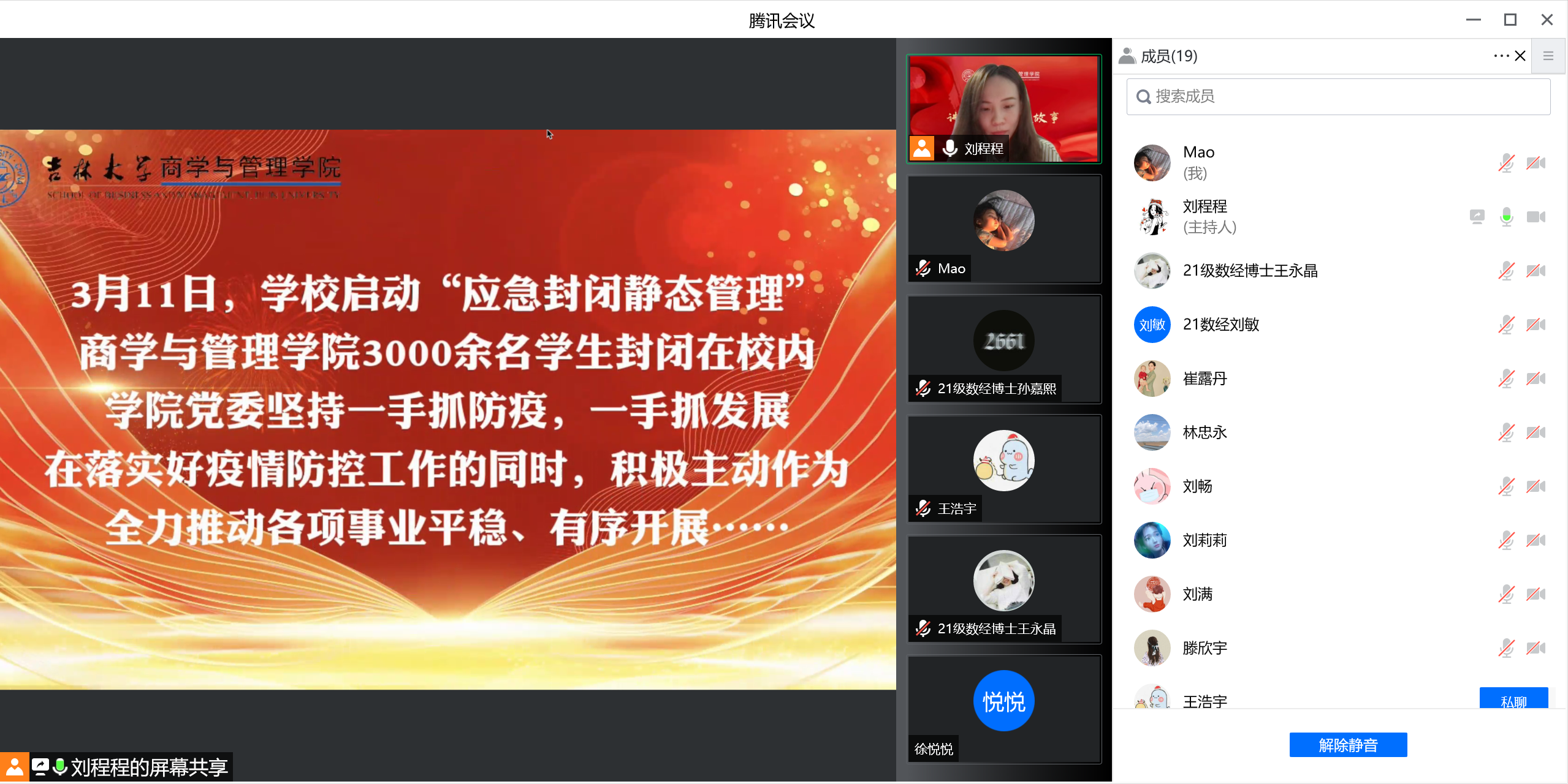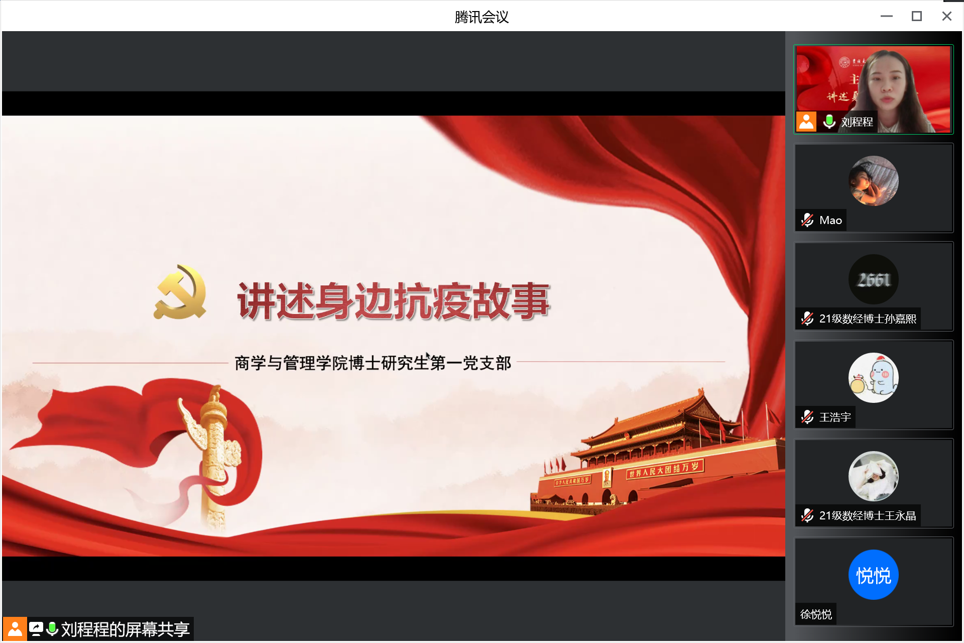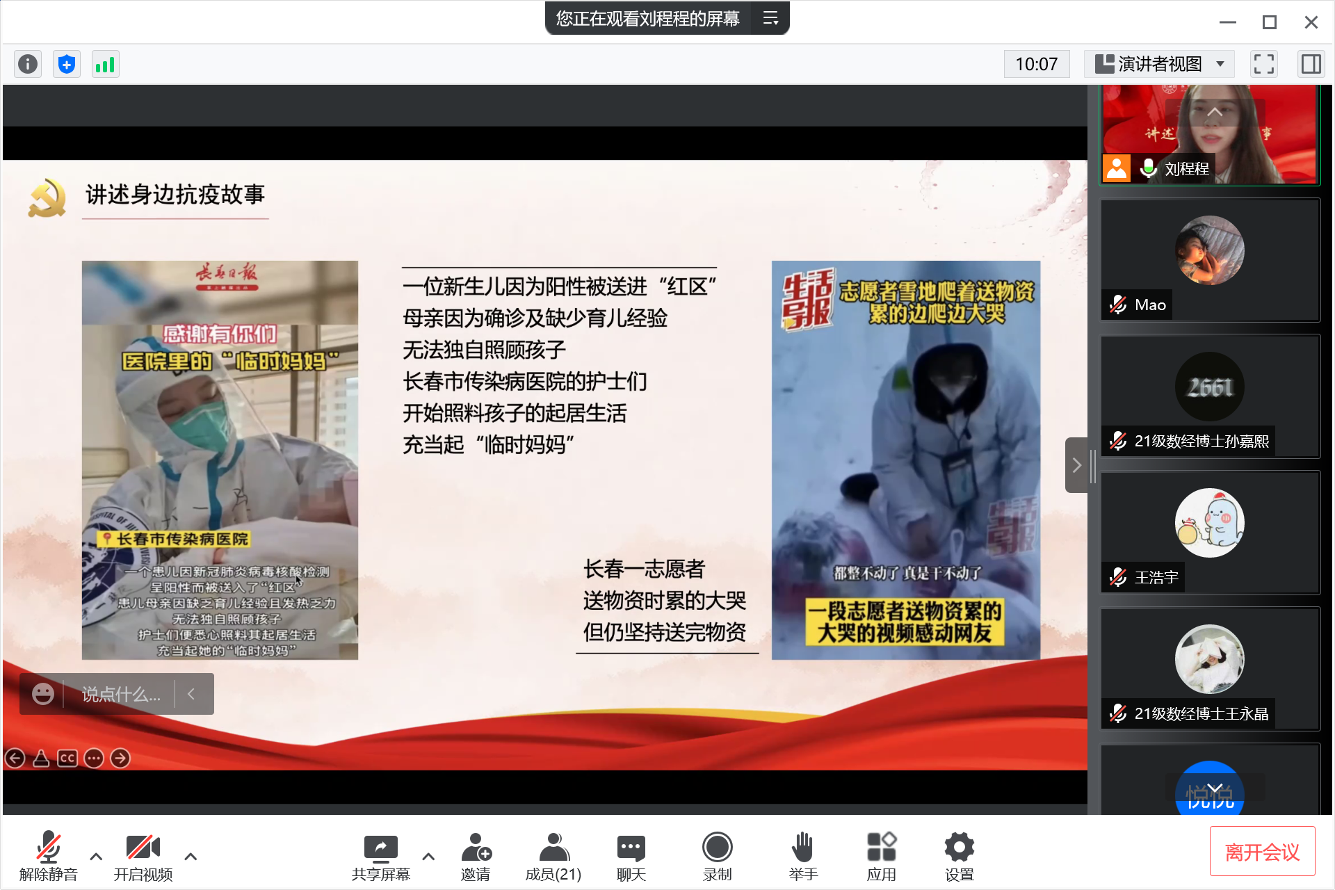 “讲述身边抗疫故事”为主题的线上党日活动开始,支部书记与全体党员分享目前吉林省全省无新增本土确诊病例的好消息,在分享喜悦的同时,提醒大家还要继续紧绷疫情防控这根弦,遵守疫情防控要求,配合防疫管理不放松,在申请返乡的同时注意防护。