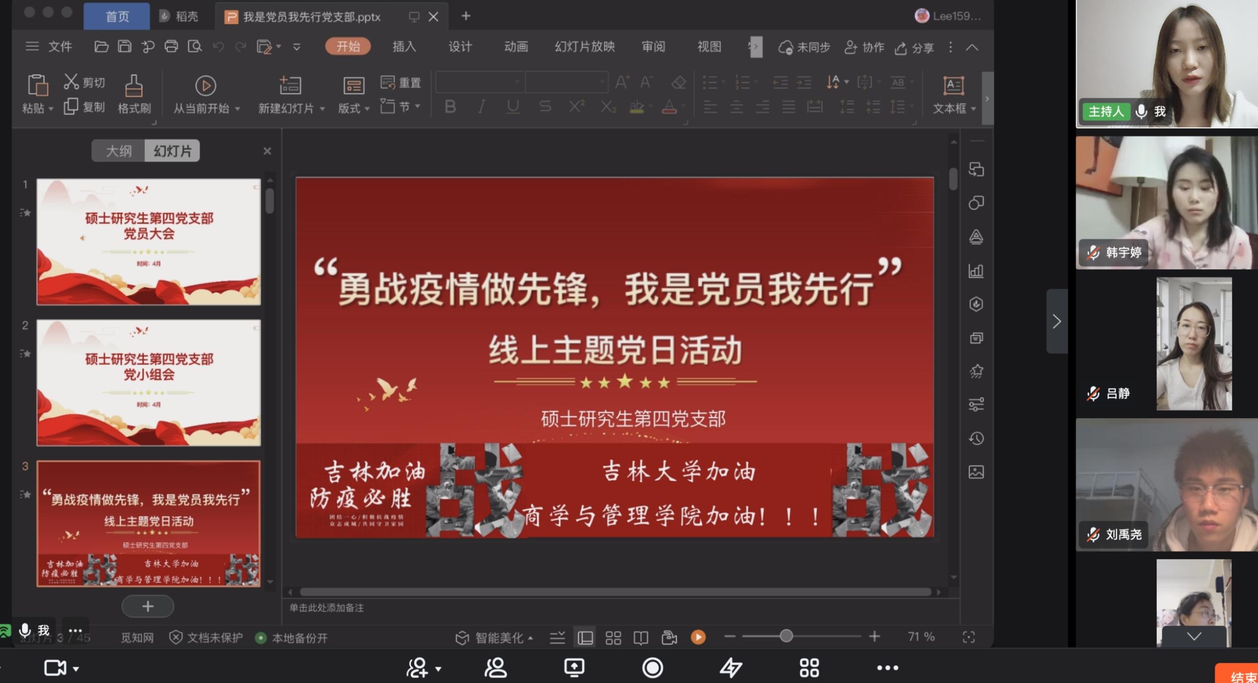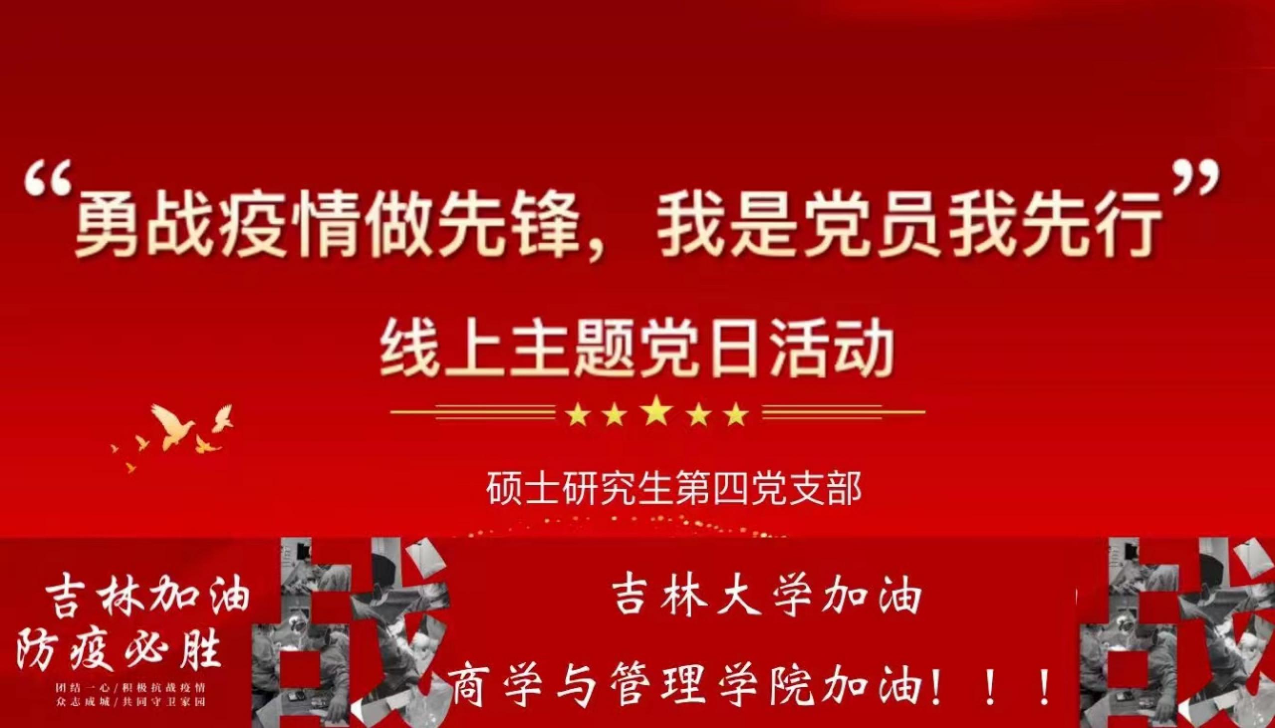 硕士研究生第四党支部开展于4月27日,下午17:10在线上钉钉会议室开展了以“勇战疫情做先锋,我是党员我先行”为主题的党日活动,调动党员及党员干部抗疫的积极性,增强党员们带领群众打赢抗疫战的信心。