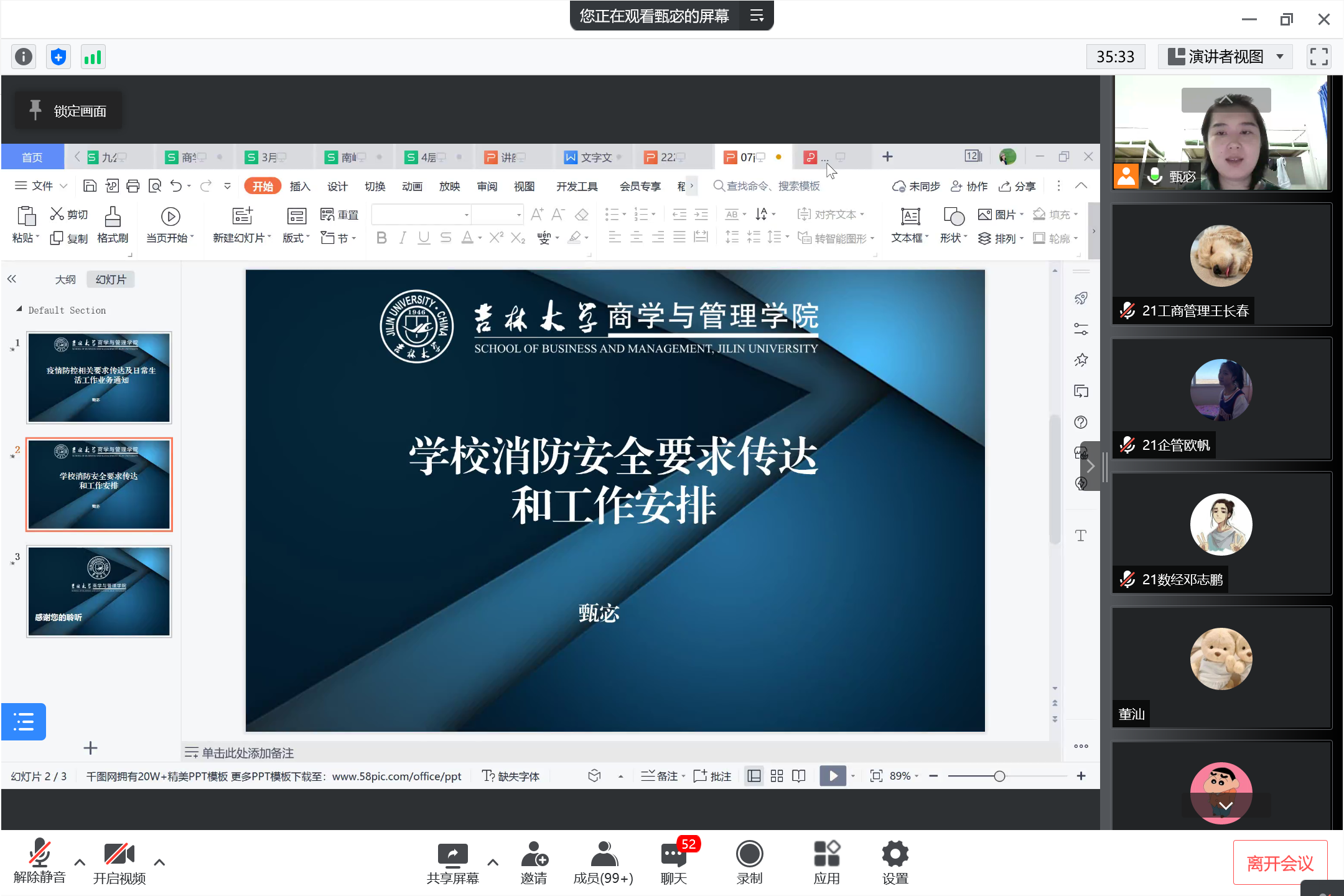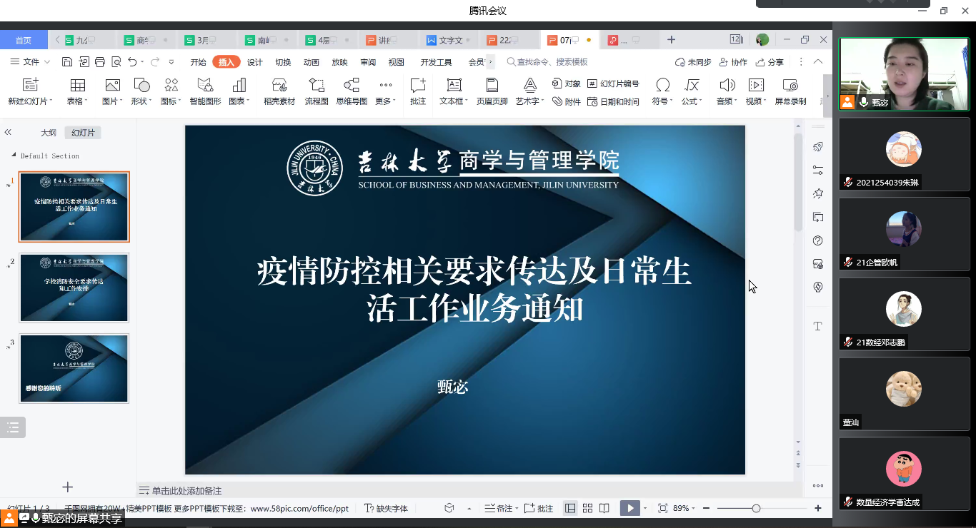 会议第二部分,甄宓老师传达了当前研究生日常工作的部署安排。关于心理方面,甄老师叮嘱同学们不仅要时刻关注自己的心理状况,同时也要关注到身边同学的心理状态,学会自我调节,并综合利用学校、学院提供的心理健康支持资源,充实自己,做彼此间的“心理卫士”;关于用药就医方面,甄老师嘱咐同学们时刻关注自身的身体健康状况,如需就医用药要第一时间与辅导员联系。对于非急性疾病要理解校医院的“用药辅导”举措,与医生沟通要清晰明确,减少不必要的麻烦;关于就业方面,甄老师强调不要因为疫情而耽误就业和政审,要及时与辅导员及就业助理联系,鼓励毕业生在疫情和毕业论文双重压力下,要及时调整心态,认真对待论文,加强与导师的交流,切勿产生懈怠心理;关于校外居住的同学方面,甄老师强调一定要注意个人防护,积极配合社区工作,保持沟通顺畅,出现问题要第一时间联系辅导员。