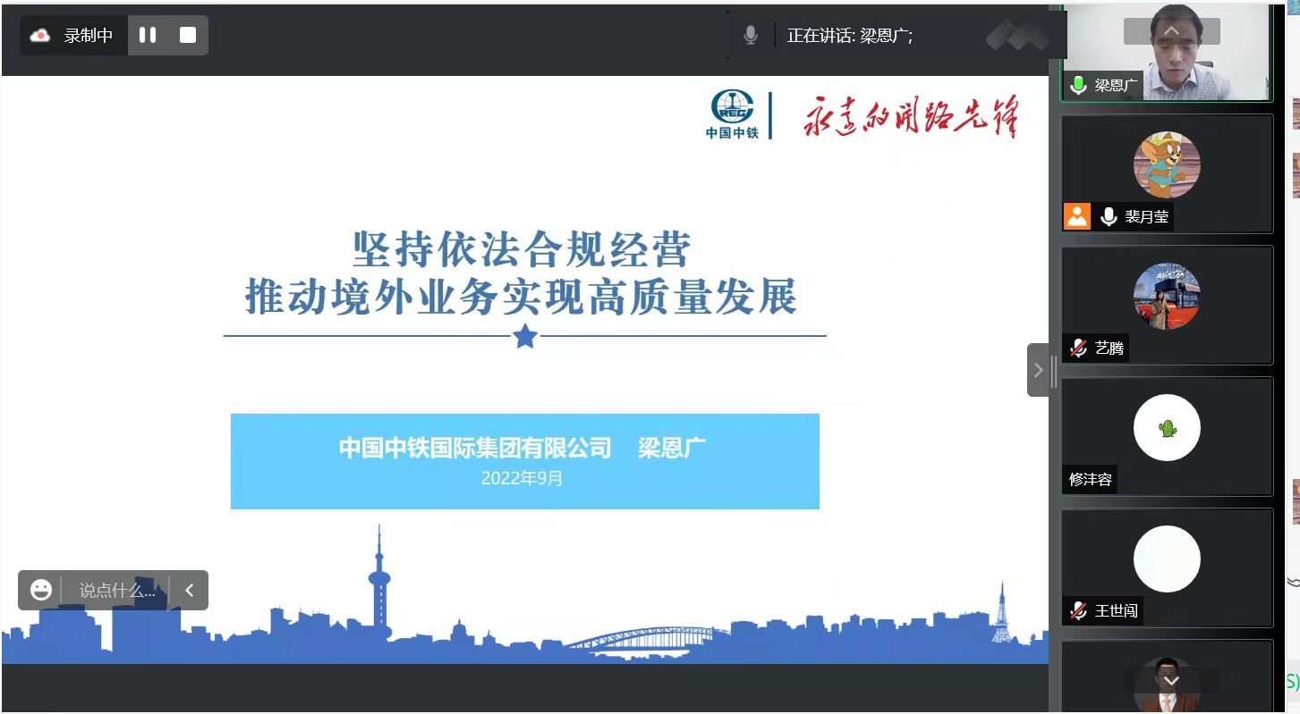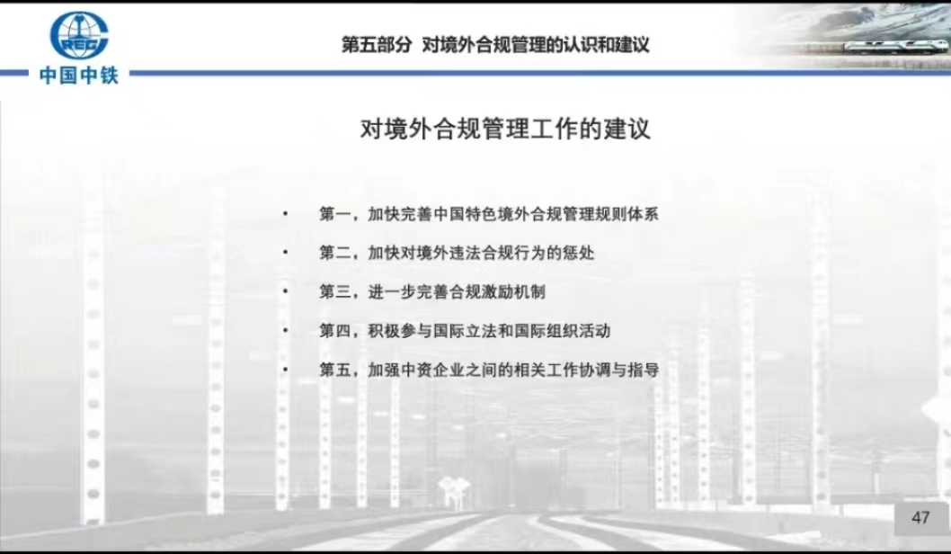 讲座最后一部分,梁恩广先生提出了对境外合规管理的认识和建议。“合规风险已经成为全球化公司的头等大事,我们没有避风港,境外合规风险一旦发生,将是我们不可承受之重”。关于境外合规管理,中国中铁秉承“五个坚持”:一、 必须坚持党的领导;二、必须坚持中国特色与遵循一般规律相统一;三、必须坚持系统观念,统筹推进;四、必须坚持内外有别;五、必须坚持境外合规管理体系权威性。梁恩广先生还对更为广泛的中国企业、中国政府的合规工作提出了建议。