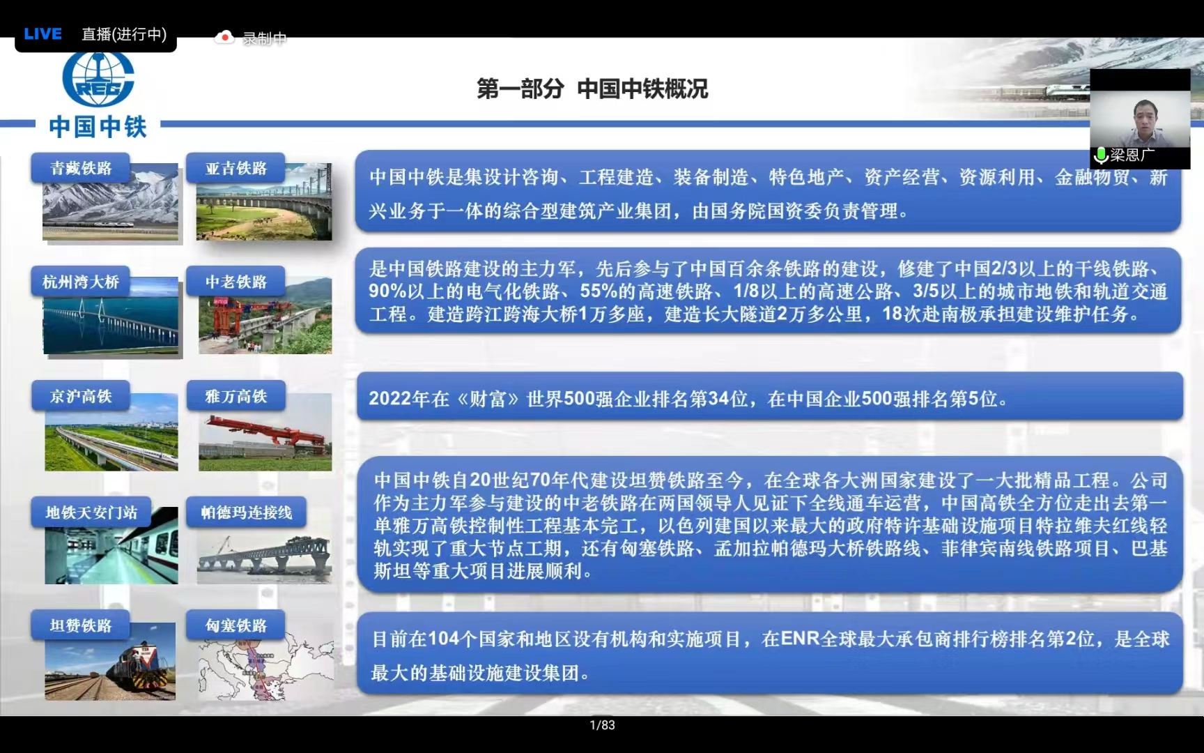 讲座伊始,梁恩广先生就中国中铁概况进行了介绍。中国中铁是由国务院国资委负责管理的综合型建筑产业集团,先后参与了中国百余条铁路的建设,目前在104个国家和地区设有机构和实施项目,在“一带一路”项目建设中发挥了主力军作用,是全球最大的基础设施建设集团。