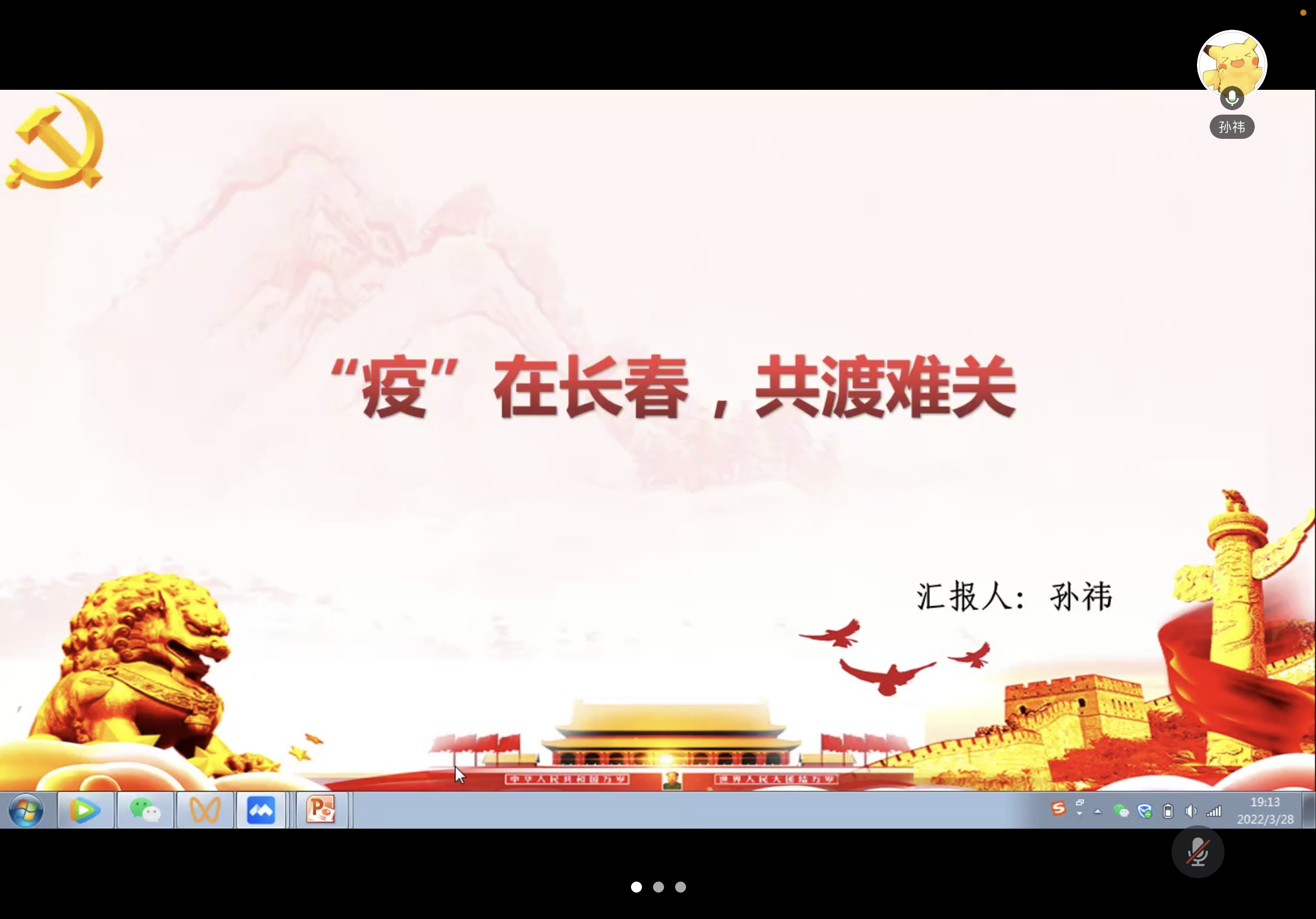 随后,支部所有党员共同观看了“吉林终有吉临时,长春定复往常春”主题微视频。通过观看视频,大家真切的感受到了本次吉林抗疫过程中党员和志愿者的付出,体会到了“从来没有岁月静好,不过是有人在为我们负重前行”的艰辛与担当。